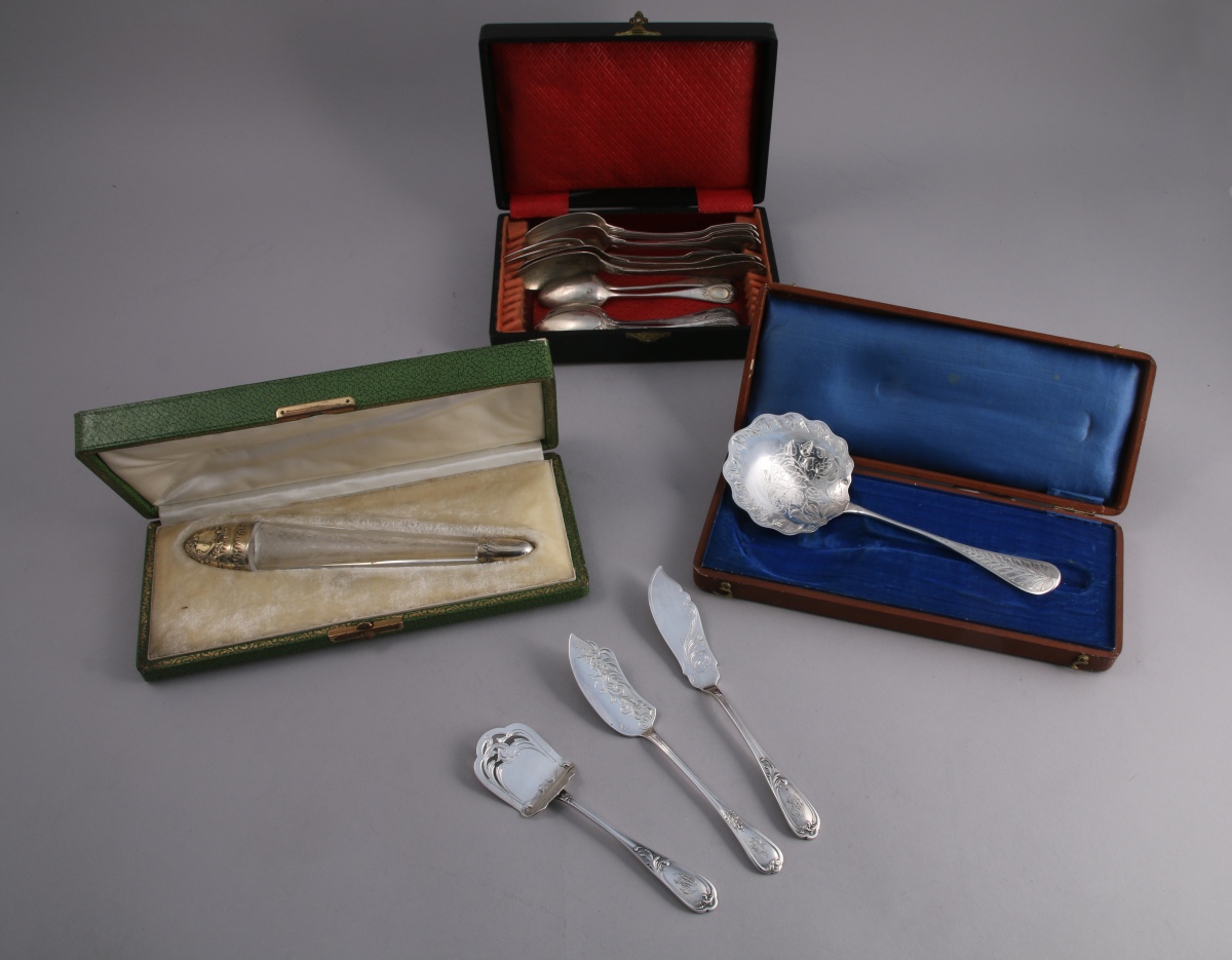 - ÉLÉMENTS DE SERVICE À HORS D'OEUVRES, 3 pièces, en argent à décor de rinceaux : une PELLE à petits-fours et un COUTEAU à beurre, d'un même service monogrammés "MD"; et un COUTEAU à beurre monogrammé "SVD". Poinçon Minerve, style Louis XV, vers 1900. Poids : 110 g.
