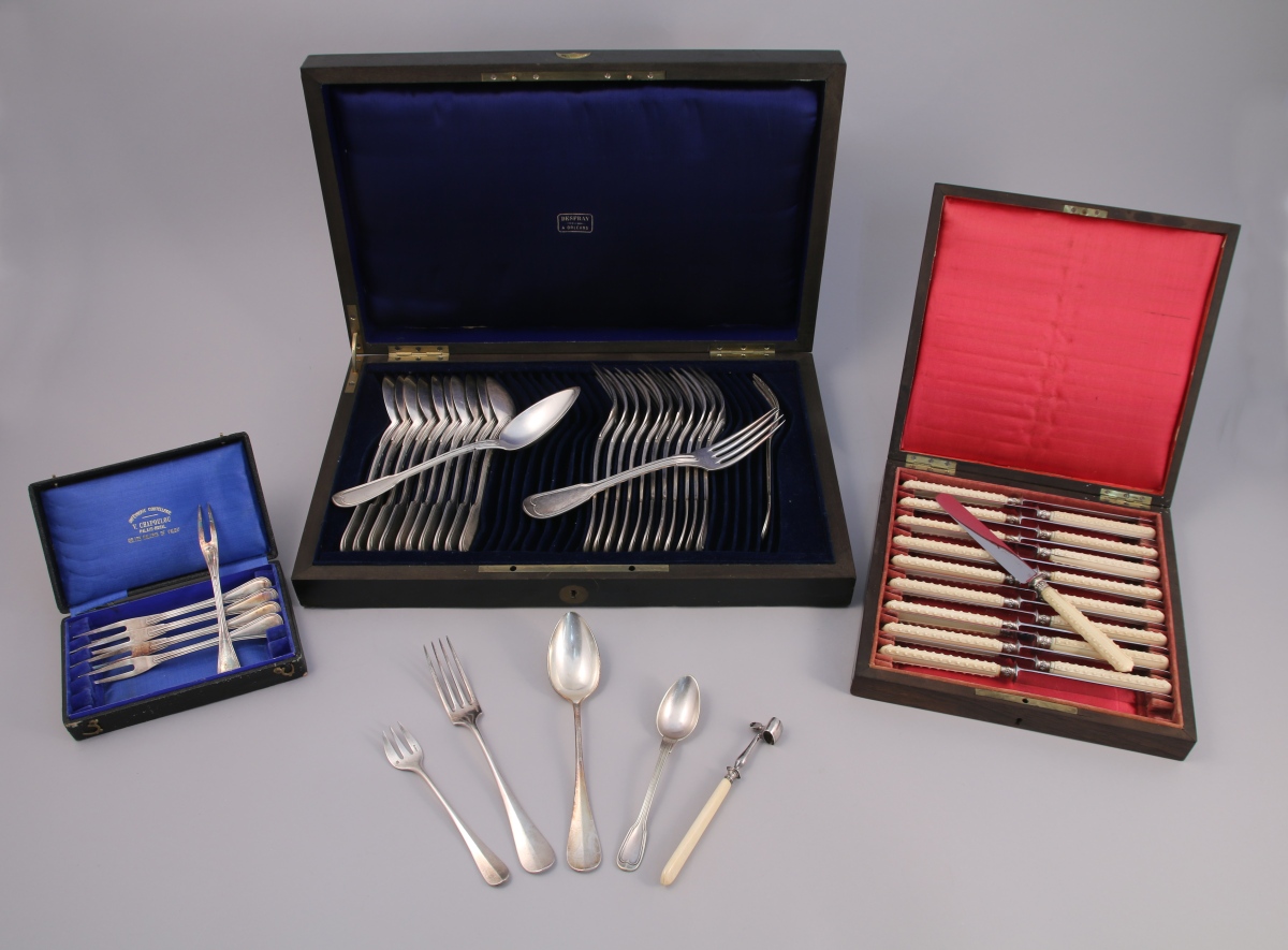- Suite de 18 COUTEAUX À DESSERT. Les manches ornés de perles. Dans un coffret en placage de palissandre et filets de laiton marqué "Couteaux". XIXe.