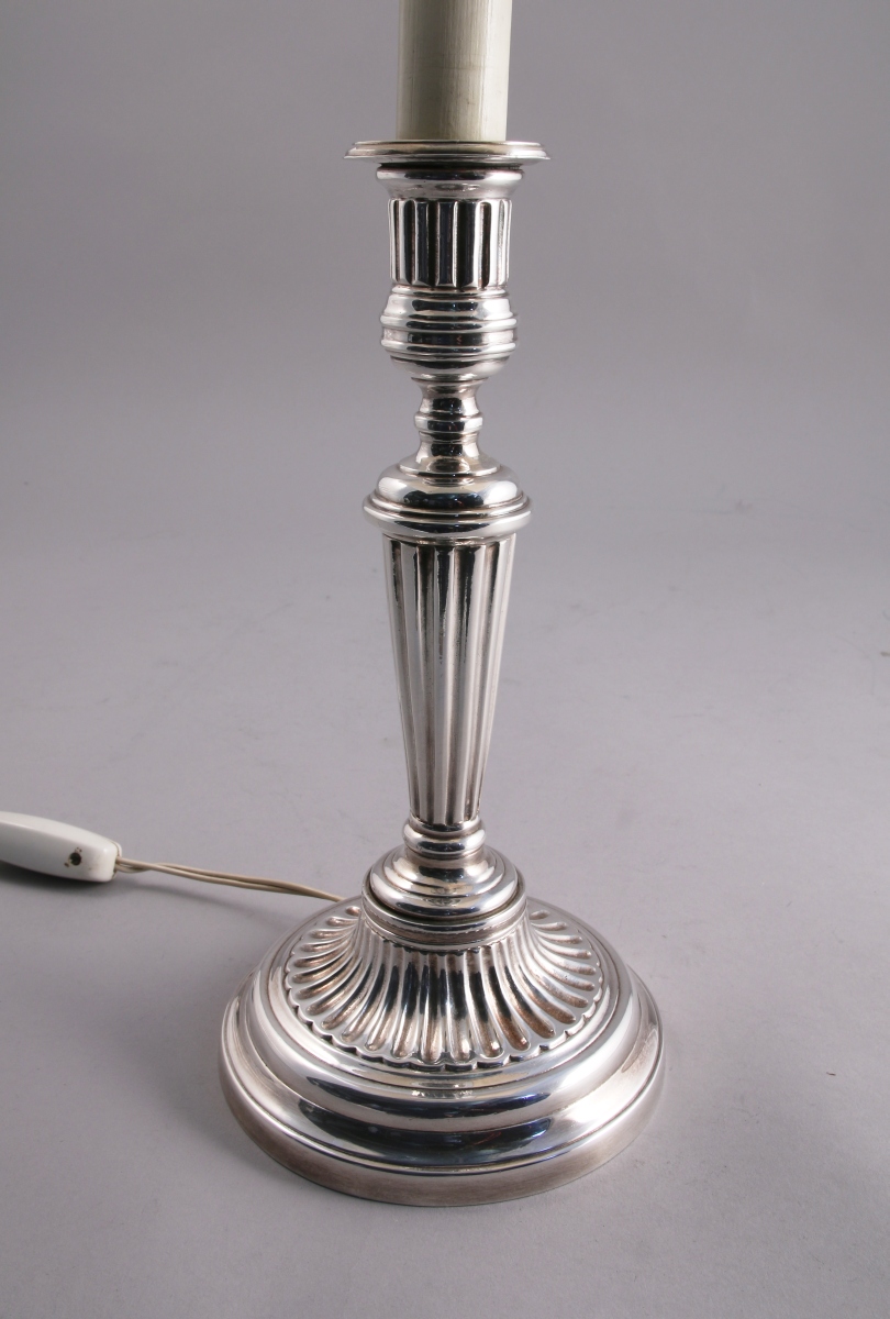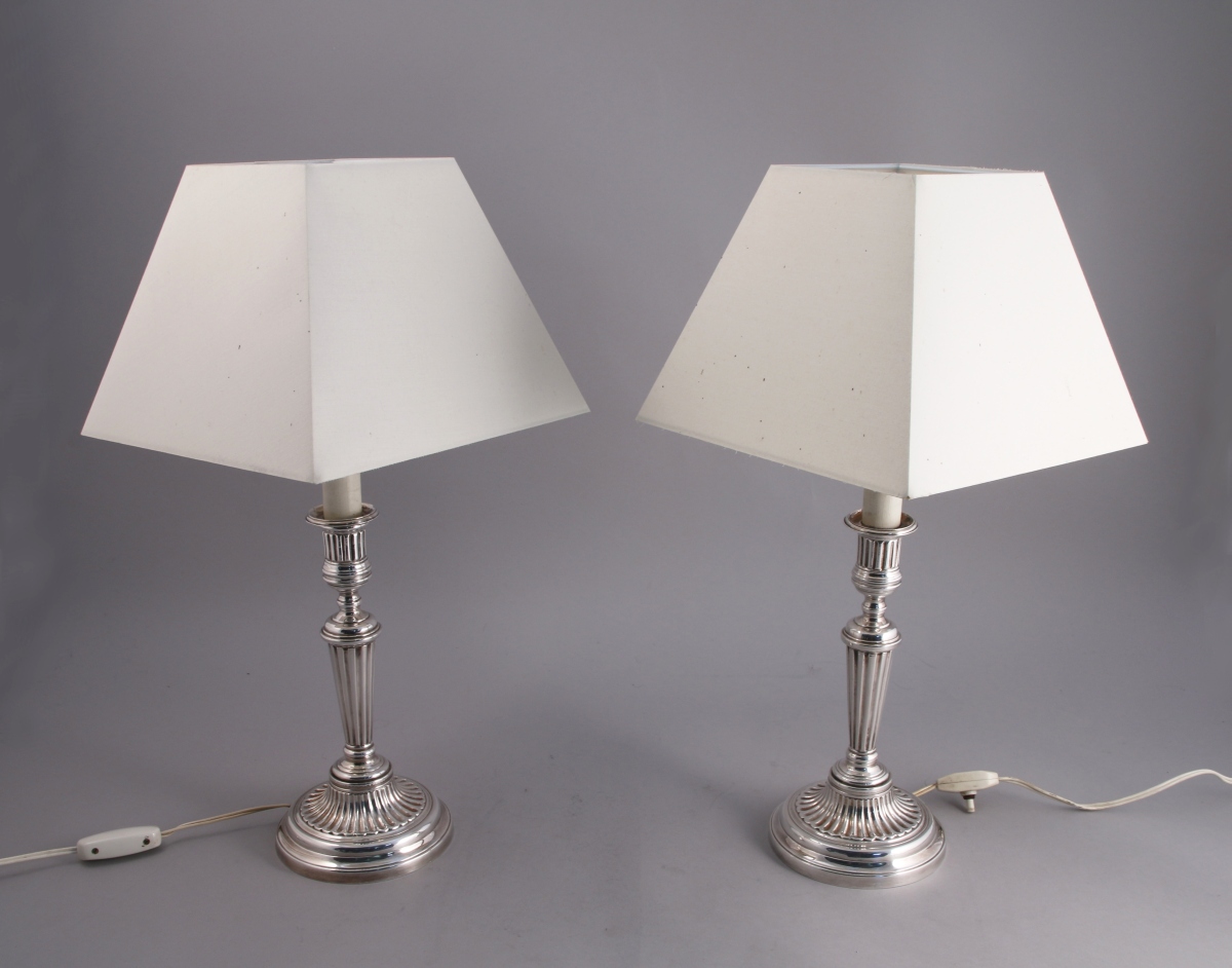 Paire de FLAMBEAUX en métal argenté. Le binet cannelé repose sur un piédouche. Le fût de section ronde fuselé et cannelé, l'ombilic à palmettes et la base circulaire à doucine.