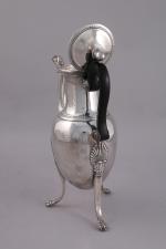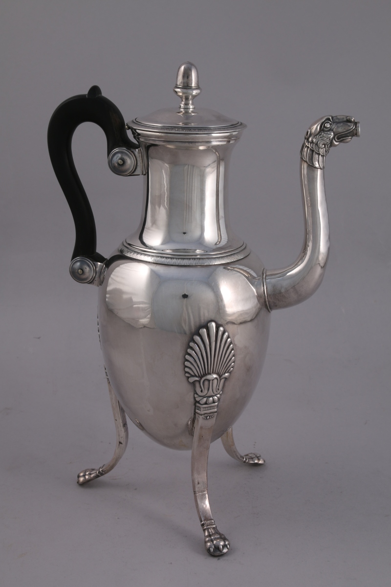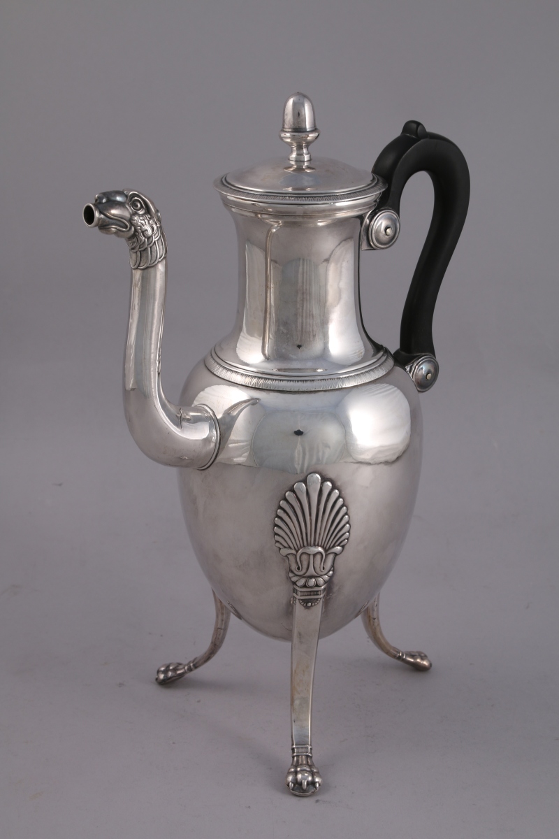 CAFETIÈRE en métal argenté. Panse de forme ovoïde reposant sur trois pieds griffe à large attache en palmette. Bec verseuseur à tête de lion. Haut col étranglé souligné d'une frise de feuilles de laurier en rappel au bord du couvercle. Fretel en gland. Anse en bois noirci.