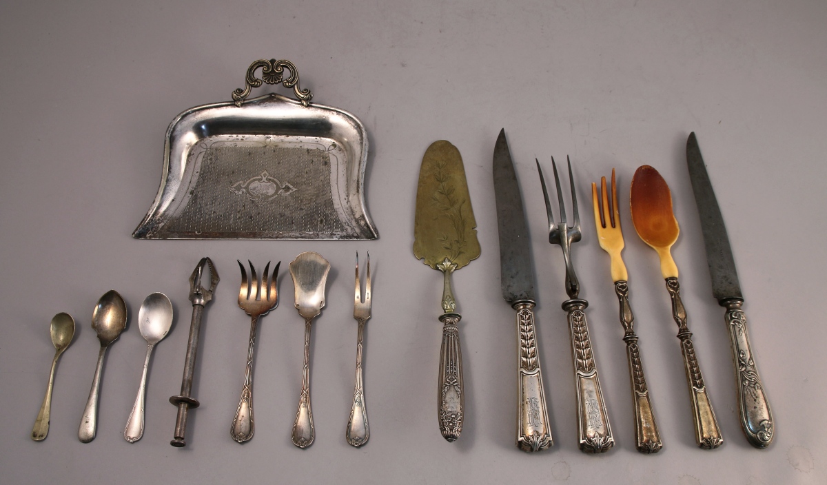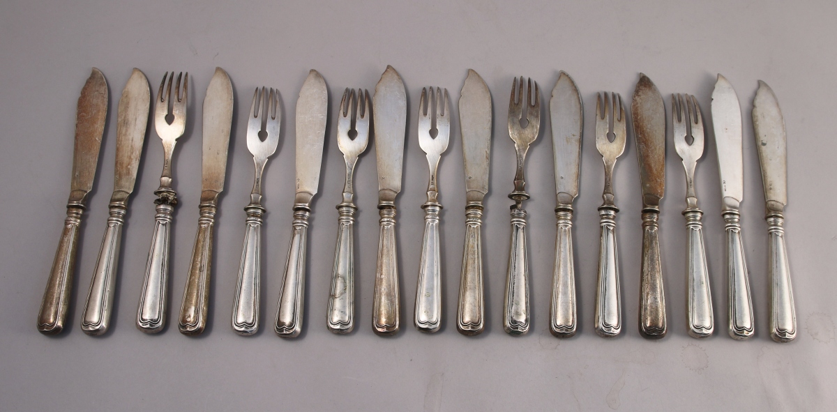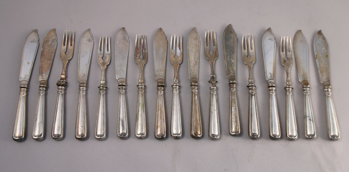 - Suite de 10 COUTEAUX et 7 FOURCHETTES À POISSON en métal argenté. Le manche en argent fourré à filets-contours. Lames et fourchons ornés d'acanthes et enroulements. Travail étranger, probablement allemand, du XXe. (accidents)