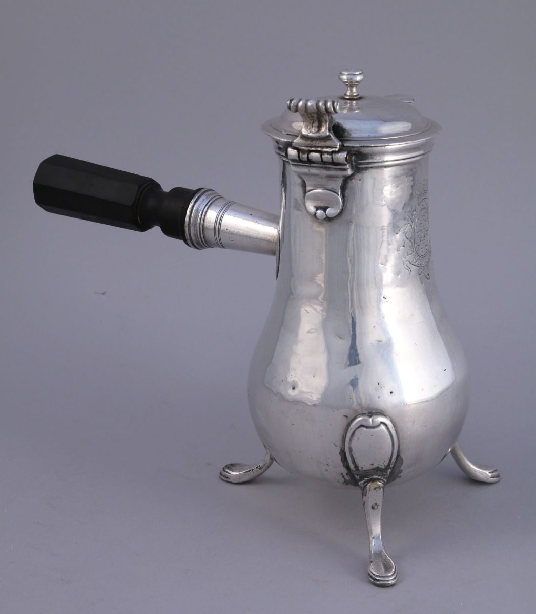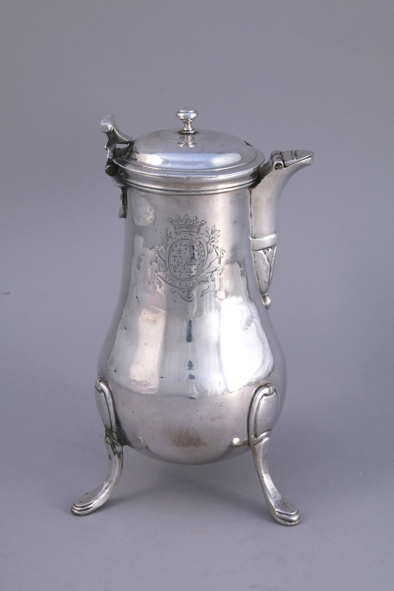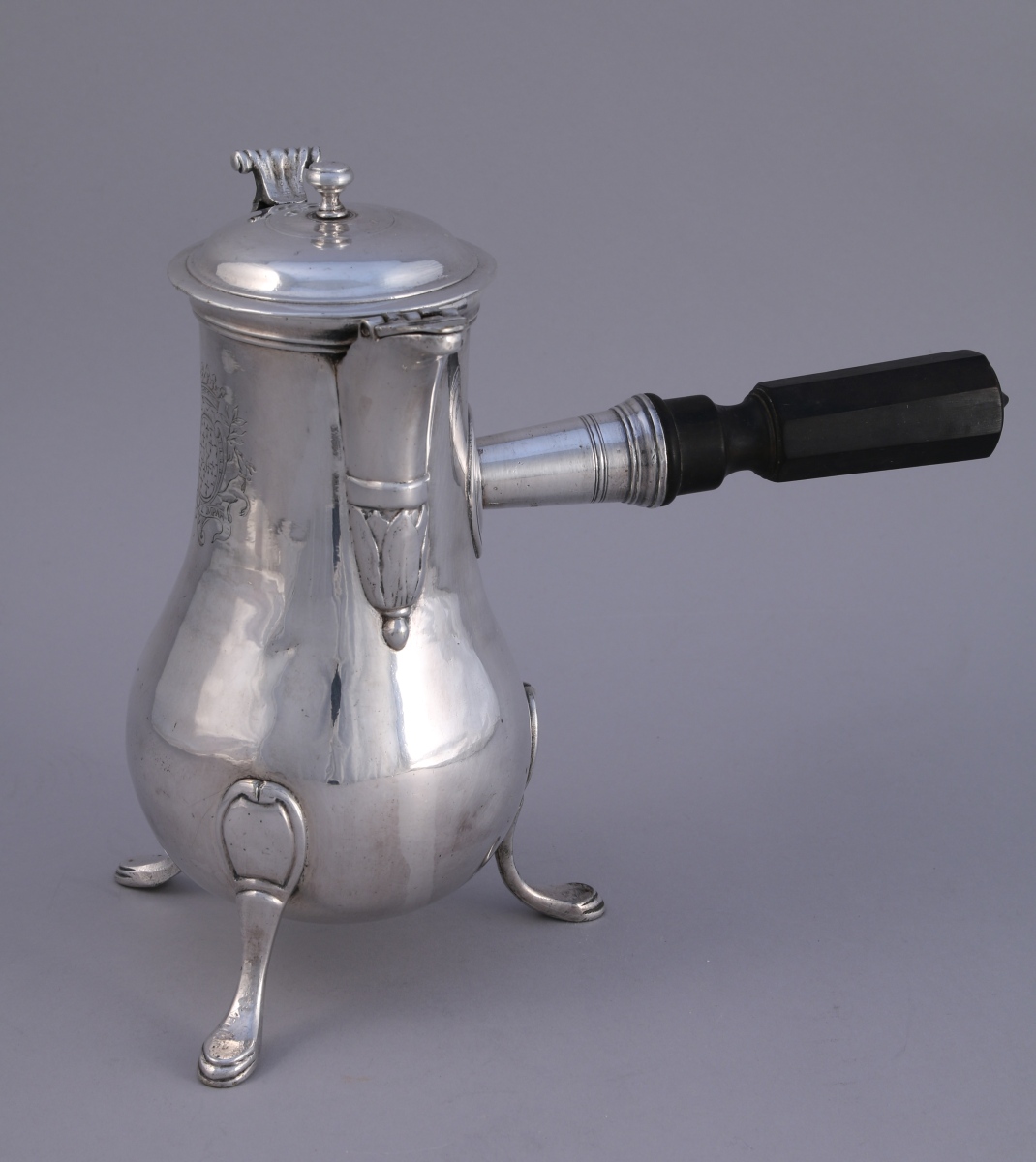 - La VERSEUSE de forme balustre à panse basse. La base du bec verseur orné de feuilles lancéolées. Le corps gravée d'armoiries (d'hermine à l'étoile d'argent) timbrées d'une couronne de marquis et supportées par deux lévriers. Devise : 'Par et impar". Manche latéral en ébène à pans. Piètement tripode. XVIIIe. Haut. 21,5 cm. (chocs)