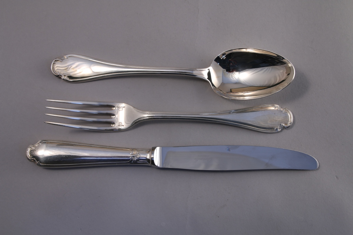 CHRISTOFLE. MÉNAGÈRE en métal argenté, 49 pièces, modèle filet-contour agrémenté d'acanthes stylisées. Bords incurvés. Elle se compose de 12 couverts, 12 grands couteaux, 12 cuillères à café et une louche. Dans ses deux écrins verts.