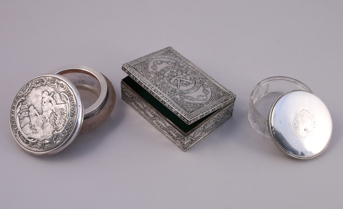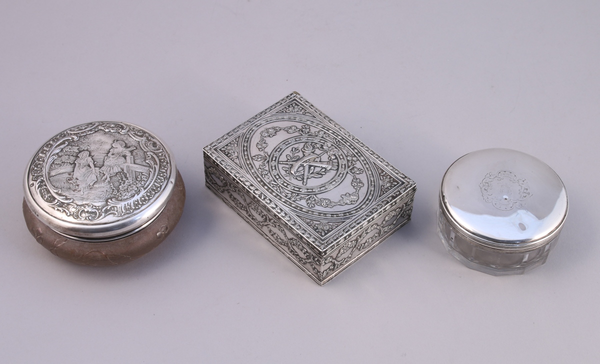 - BOÎTE À POUDRE de forme circulaire, corps en cristal taillé à pans, couvercle en argent gravé d'un cartouche rocaille. Poinçon Minerve, fin XIXe, début XXe. Diam. 8 cm. Poids du couvercle : 35 g. (chocs)