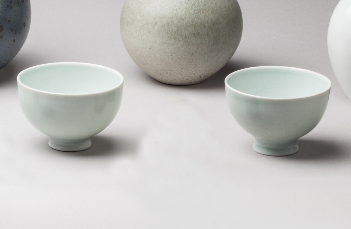 Paire de COUPES SUR TALON en grès émaillé. Signées.