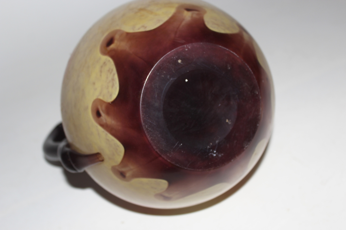 PICHET à corps boule en verre multicouche à décors marmoréen, l'anse violette.