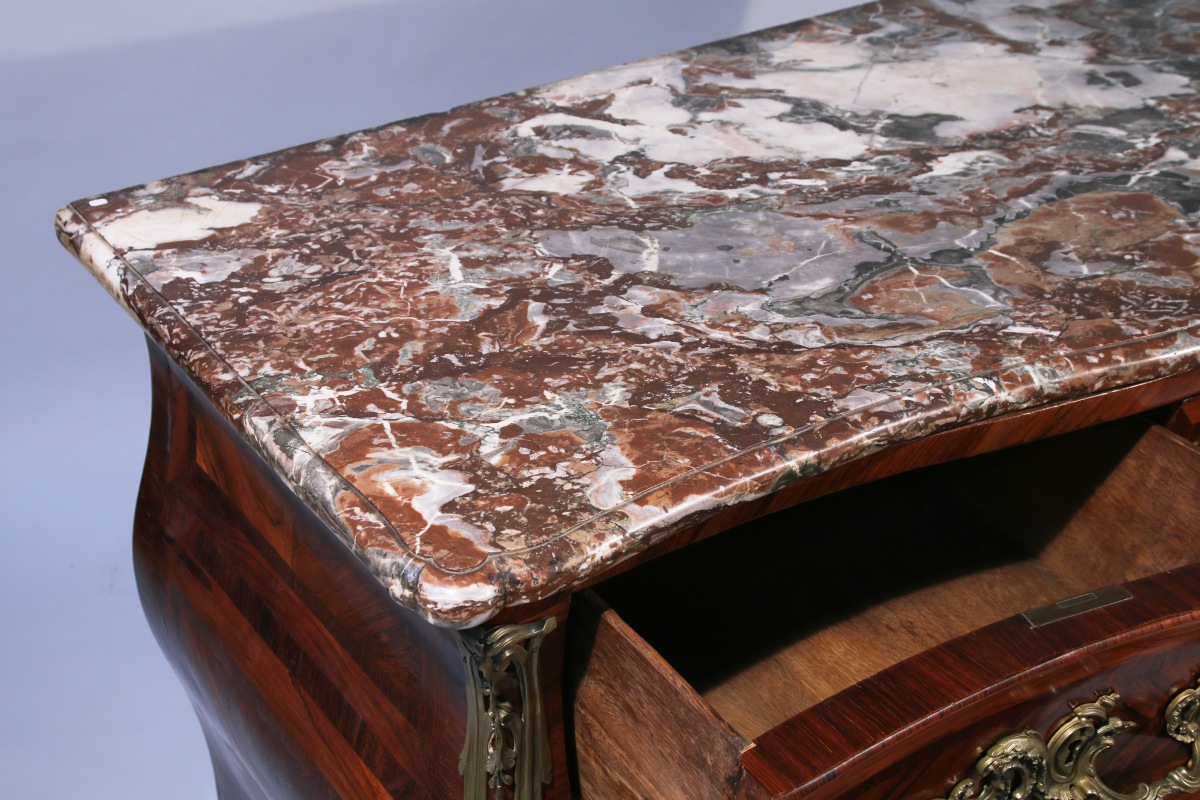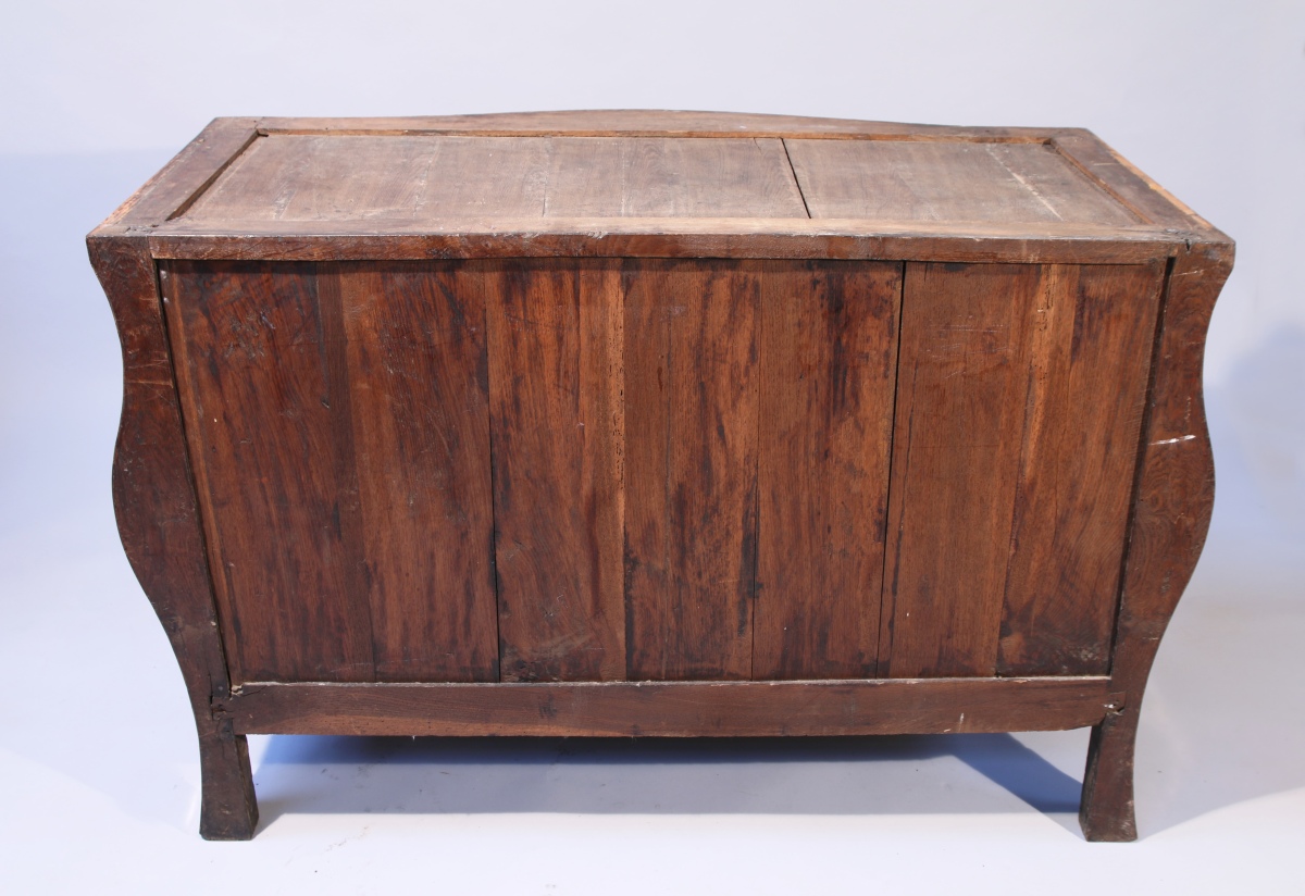 COMMODE TOMBEAU en chêne, fonds de sapin et placage de bois de violette marqueté en frisage géométrique, compartiments et filets. La commode ouvre à cinq tiroirs sur trois rangs dont trois dans la partie supérieure, le tiroir central secret à système. Garniture de bronzes ciselés tels que entrées de serrure, poignées de tirage, chutes, cul de lampe et sabots de style rocaille.
