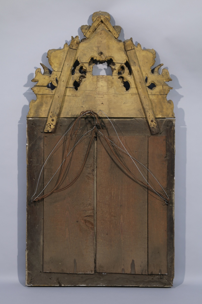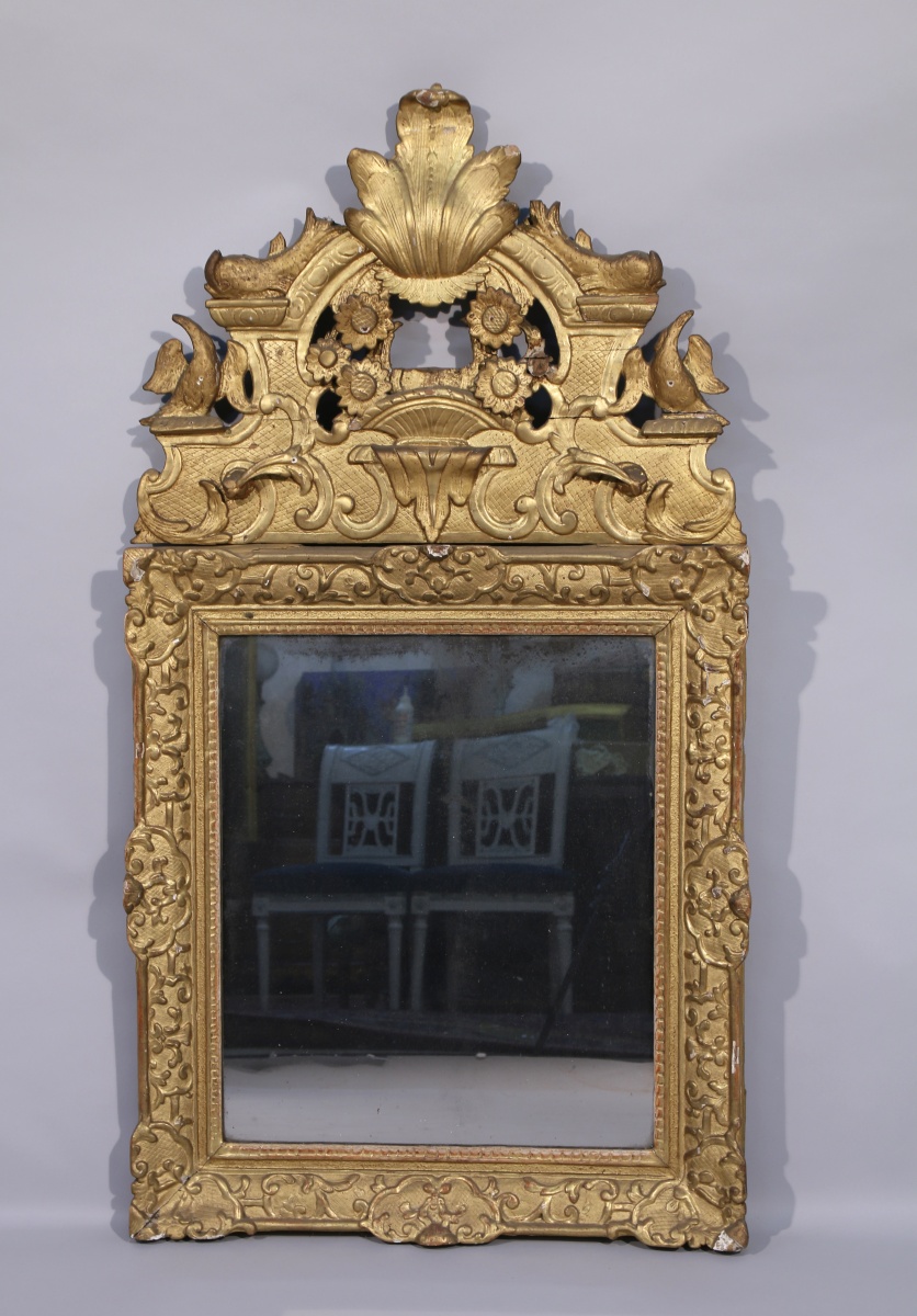 MIROIR à FRONTON en bois sculpté, stuqué et doré. Motif ajouré d'un vase fleuri, d'acanthes, dauphins, oiseaux et coquilles.