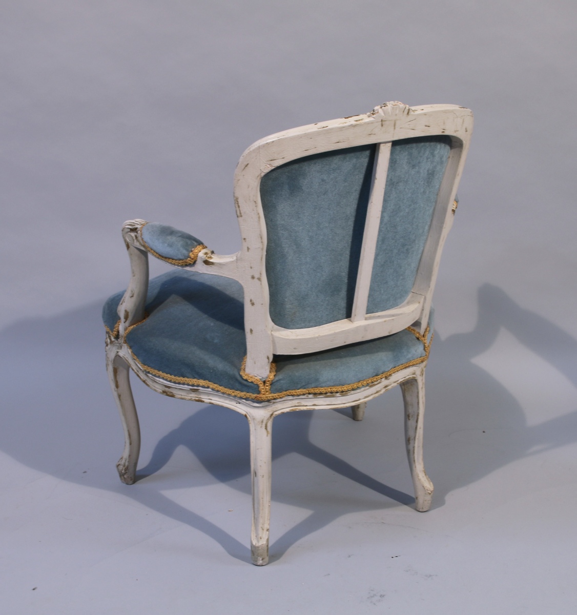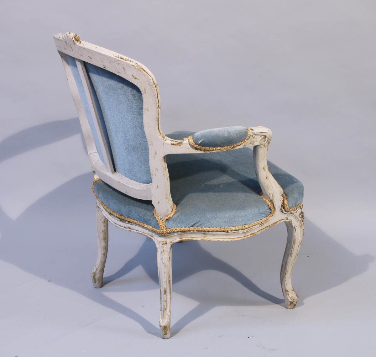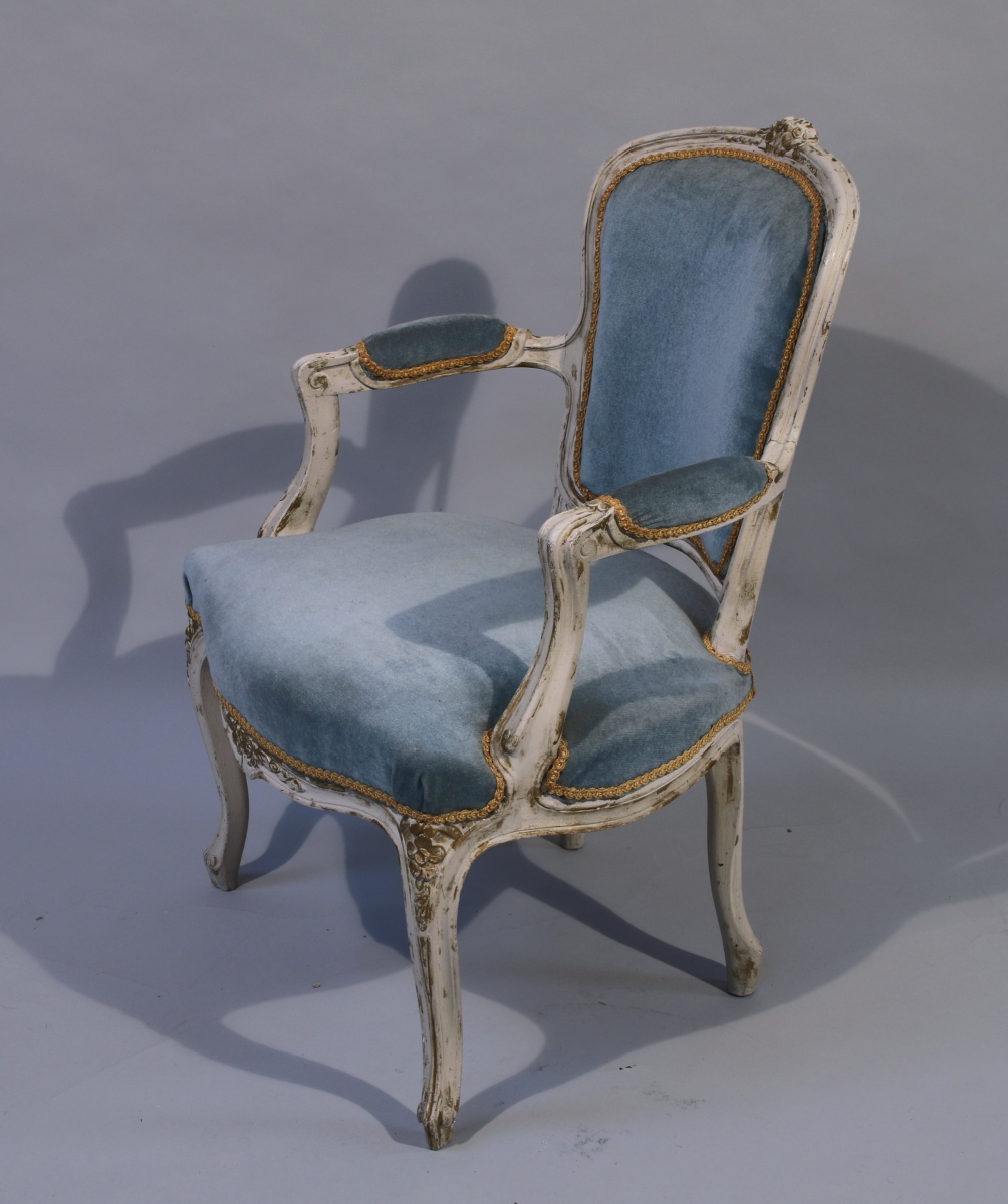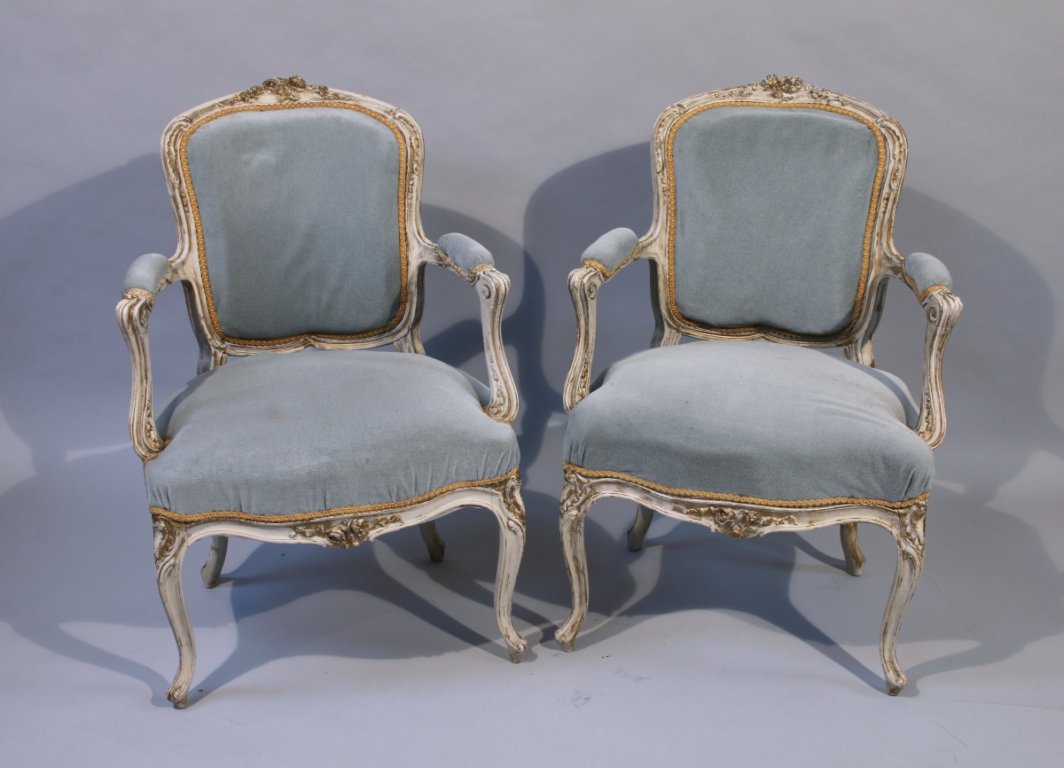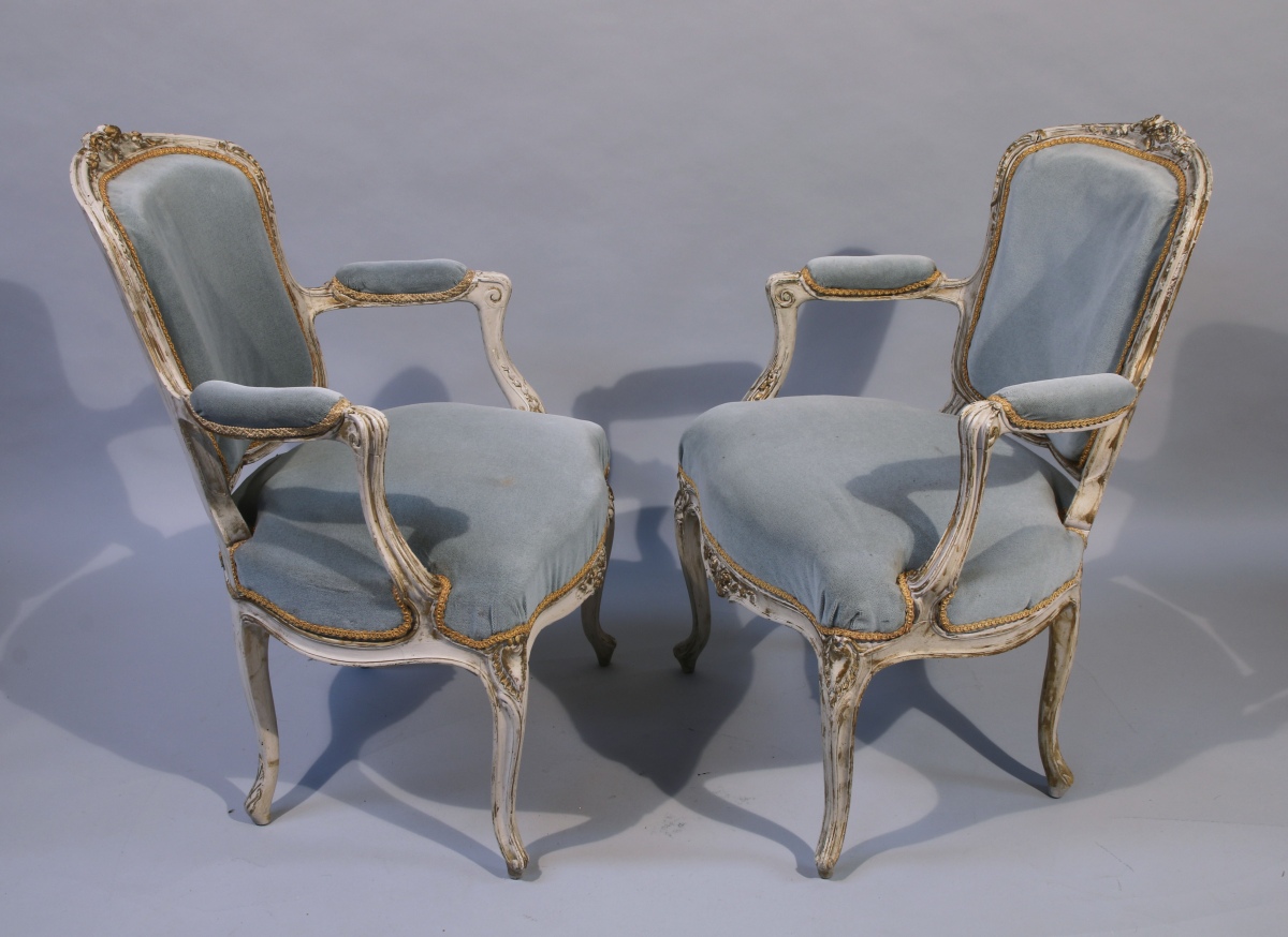 ENSEMBLE de TROIS FAUTEUILS CABRIOLETS composé d'une paire et d'un fauteuil, en bois mouluré, sculpté de motifs floraux et coquilles, laqué gris. Consoles d'accotoirs en coup de fouet. Ils reposent sur quatre pieds cambrés. Des traces de dorure.