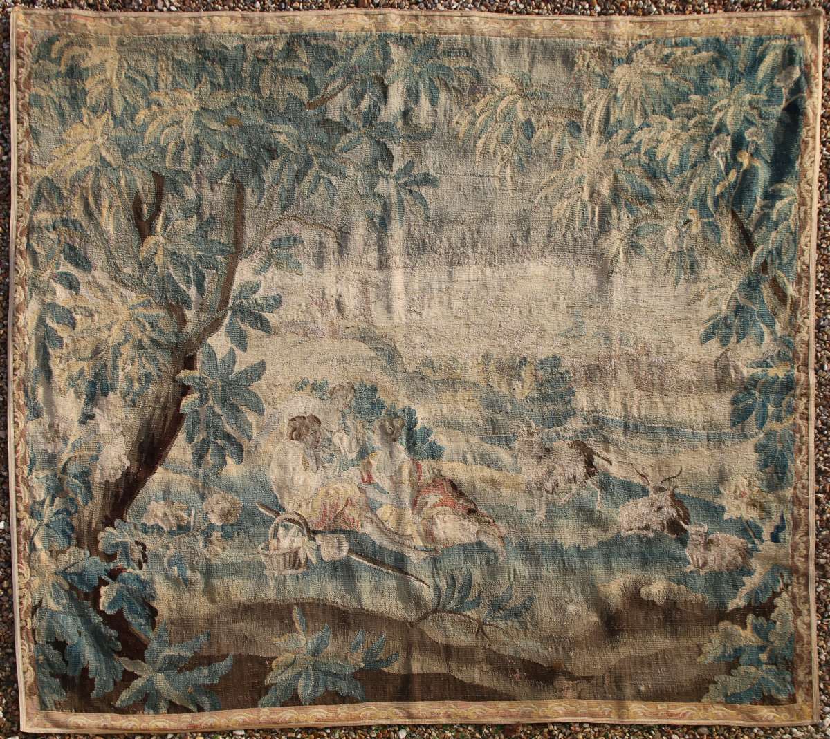 AUBUSSON. TAPISSERIE en laine à décor d'une scène pastorale figurant un berger et deux bergères en conversation entourés de leurs chèvres au pied d'un arbre. Paysage vallonné et architecturé. Fine bordure à rinceaux.