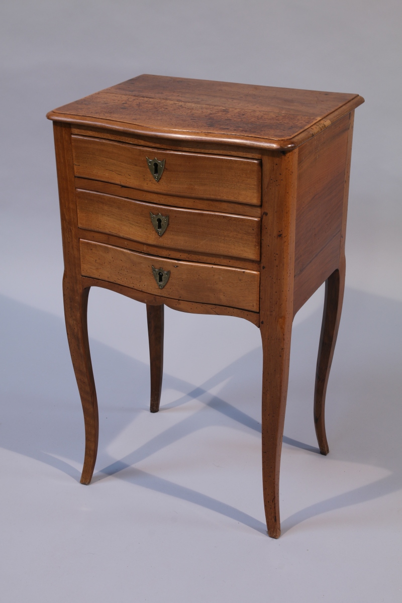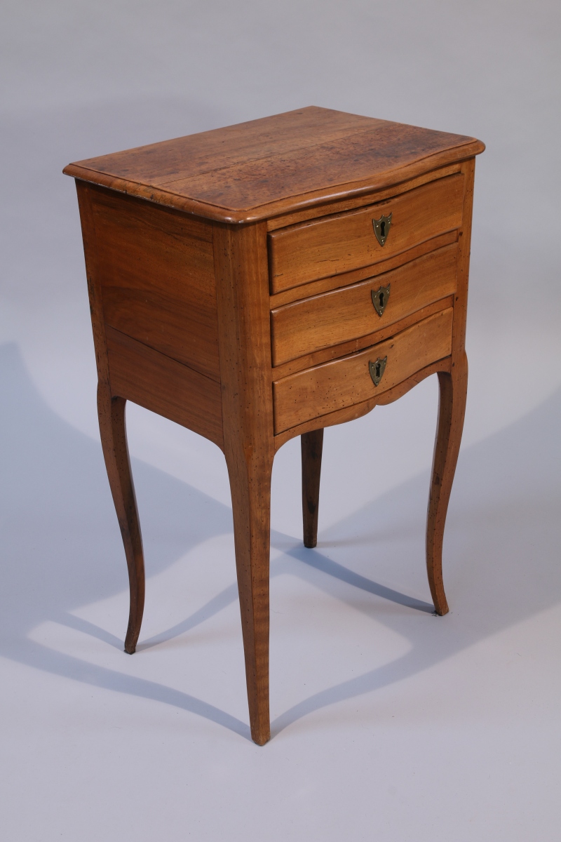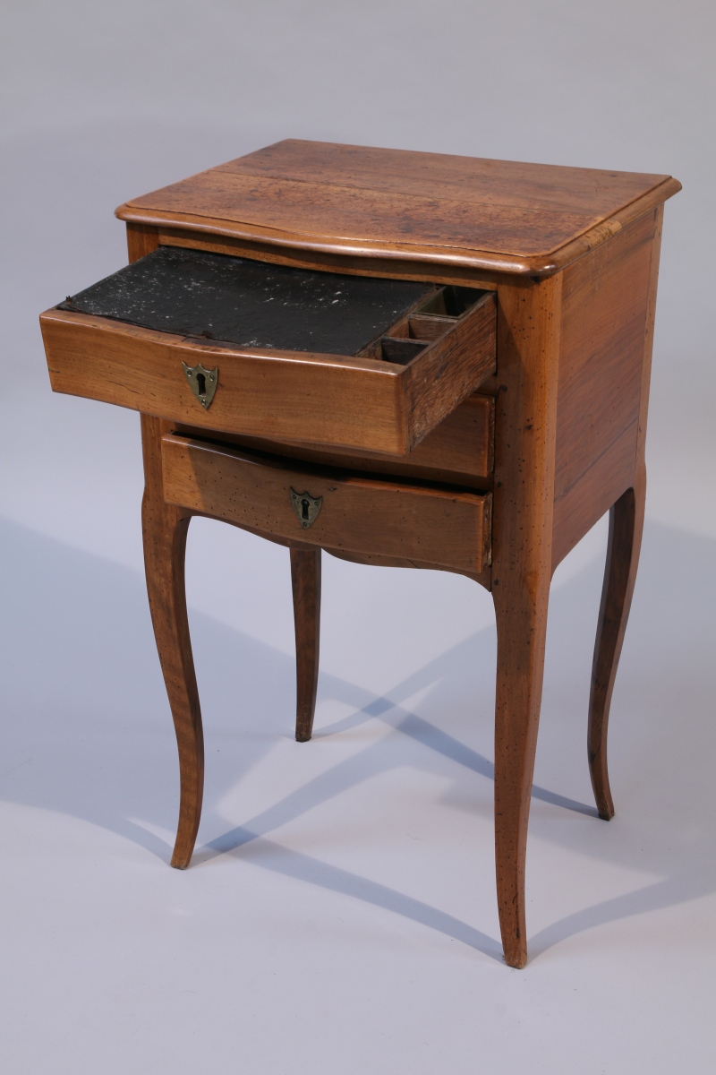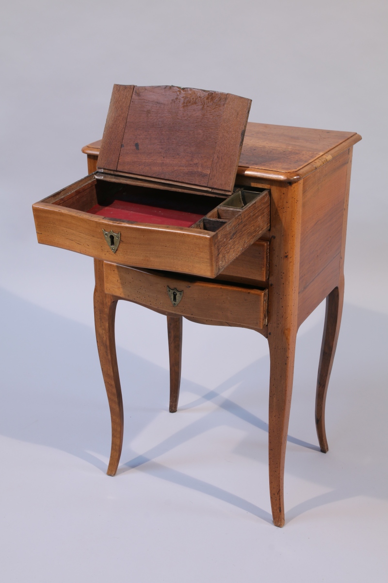 TABLE VOLANTE de forme rectangulaire en noyer, ouvrant en façade à trois tiroirs, celui du haut compartimenté formant écritoire. Elle repose sur quatre pieds cambrés.