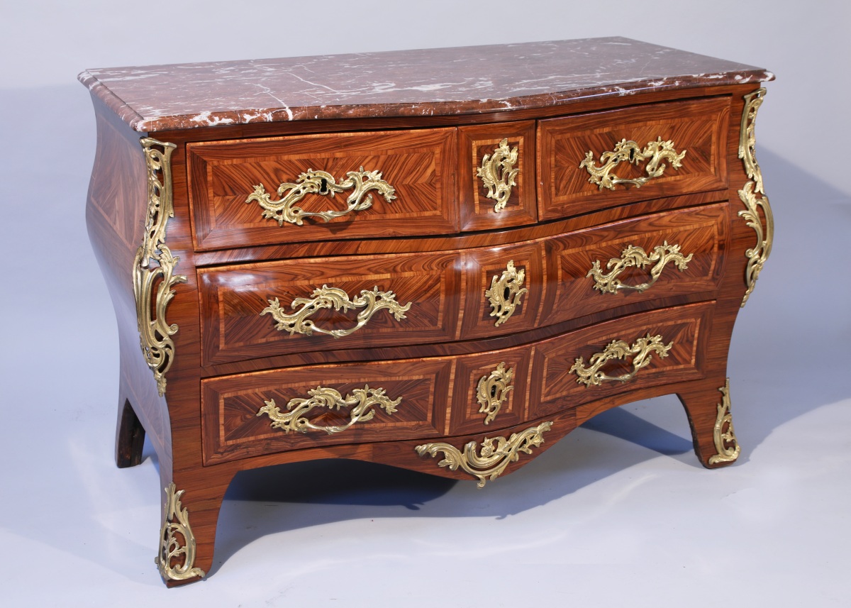 Belle COMMODE TOMBEAU en bois de placage de violette en frise ouvrant à cinq tiroirs sur trois rangs. Ornementation de bronzes dorés tels que entrées de serrure, poignées de tirage, chutes, cul de lampe et sabots de style rocaille.