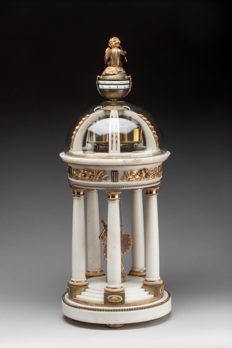L'originalité de notre pendule réside dans son cadran tournant horizontal. Si l'on dénombre quelques rares modèles sous les règnes de Louis XIV et Louis XV, ce mécanisme est plus fréquent dans la deuxième moitié du XVIIIe. Constitué de deux cercles indépendants (pour les heures et les minutes), il s'inscrit aisément dans une urne, un globe ou brûle-parfum en bronze, en porcelaine ou en marbre. Les aiguilles ont laissé place à une flèche, une tête de serpent ou au doigt d'une nymphe indiquant délicatement l'heure. La mesure du temps devient ainsi un prétexte, en s'inscrivant dans une composition harmonieuse qui permet à l'artiste de déployer toute sa créativité.