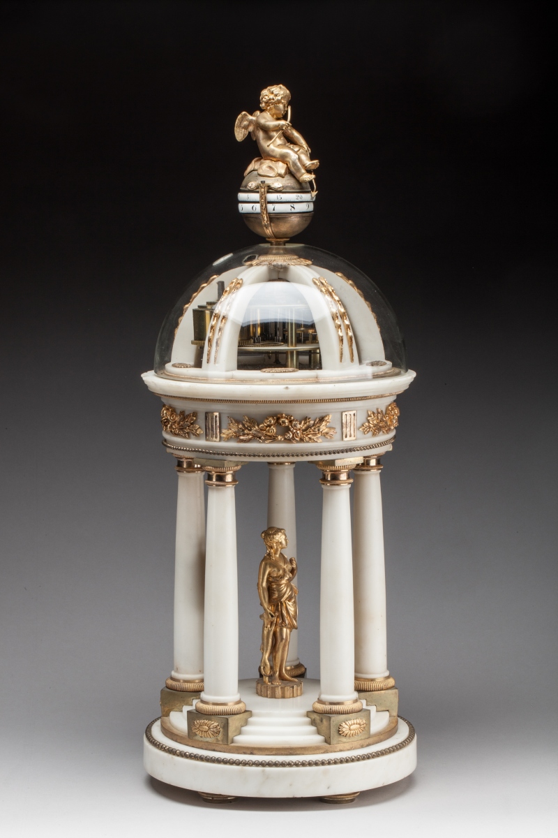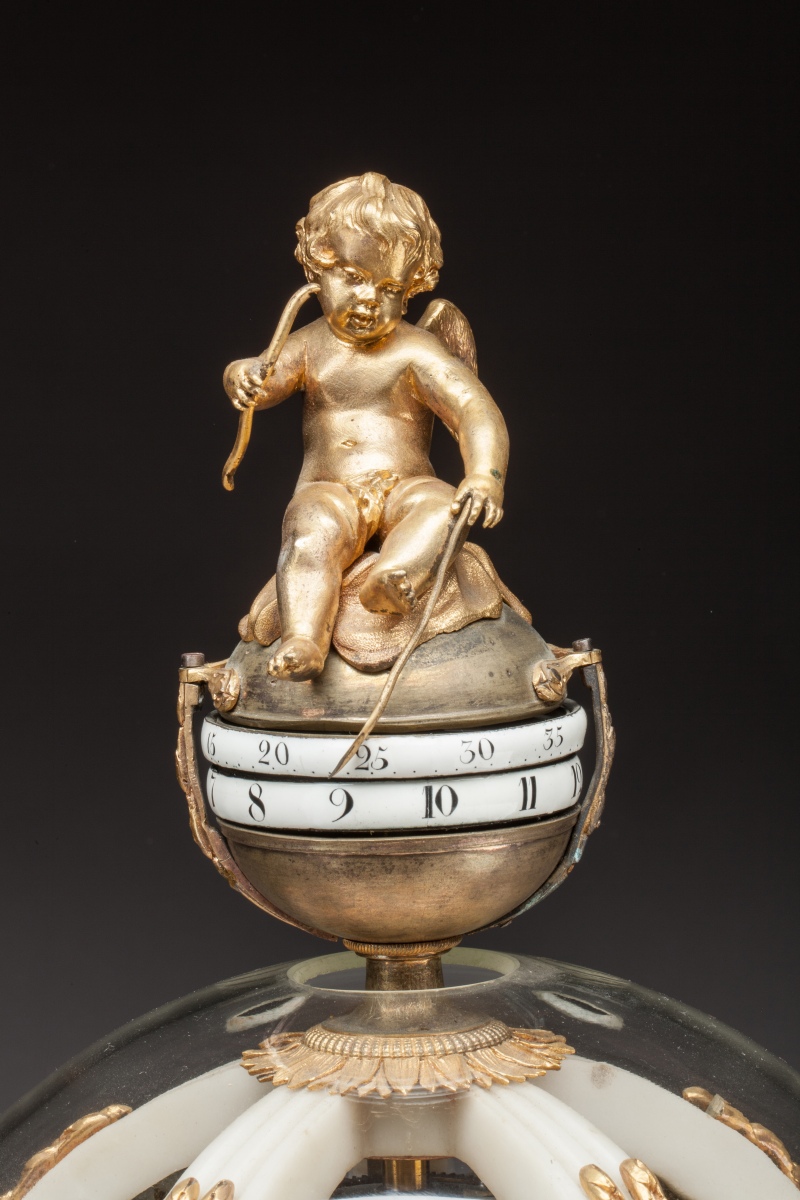 Au sommet d'un temple circulaire, une figure de Cupidon en bronze doré repose sur un globe lui-même encerclé par deux bagues émaillées donnant en chiffres arabes l'une l'heure et l'autre les minutes. L'Amour montre l'heure avec une flèche tenue dans sa main gauche, alors que la droite porte un arc.