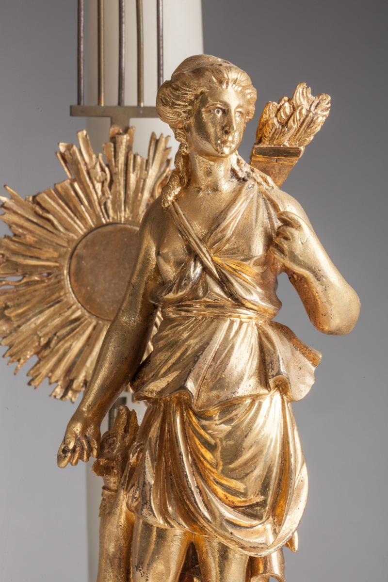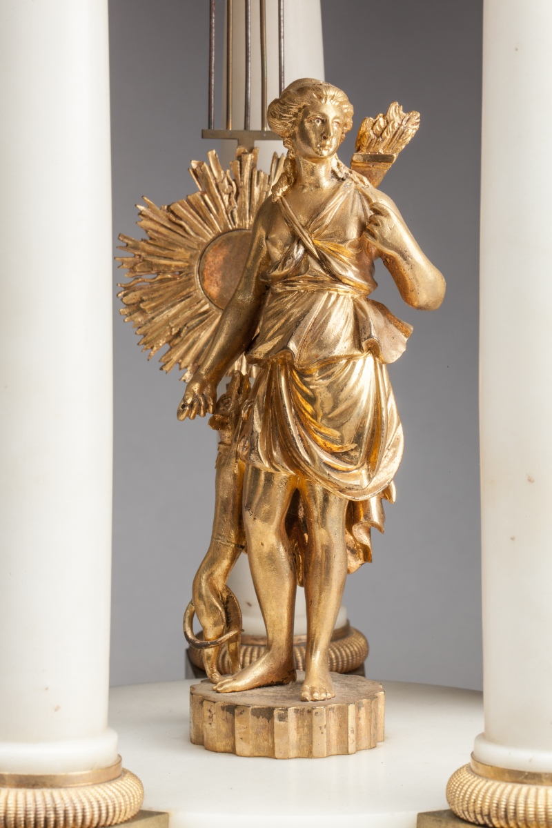 Cinq colonnes fuselées en marbre blanc soutiennent l'ensemble. Leurs chapiteaux en bronze doré sont d'ordre dorique et leurs bases quadrangulaires sont appliquées de tores de laurier et de fleurs de tournesol. Au centre de la colonnade, une statuette en bronze doré de la déesse Diane chasseresse se dresse avec son fidèle lévrier à ses côtés. Derrière la déesse, un balancier en forme de soleil en bronze ciselé et doré donne le rythme du mécanisme.