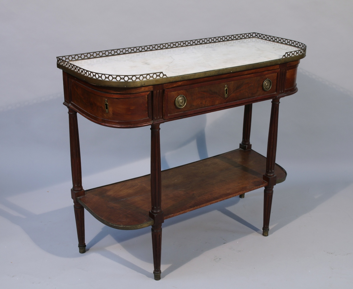 DESSERTE de forme oblongue en acajou et placage d'acajou. Elle ouvre par trois tiroirs en ceinture dont deux dans les arrondis. Elle repose sur quatre pieds fuselés et cannelés réunis par une tablette d'entretoise. Ornementation de laiton tels qu'anneaux de tirage, entrées de serrures et sabots. Le plateau foncé d'un marbre blanc (accidenté) ceint d'une galerie de laiton ajourée.