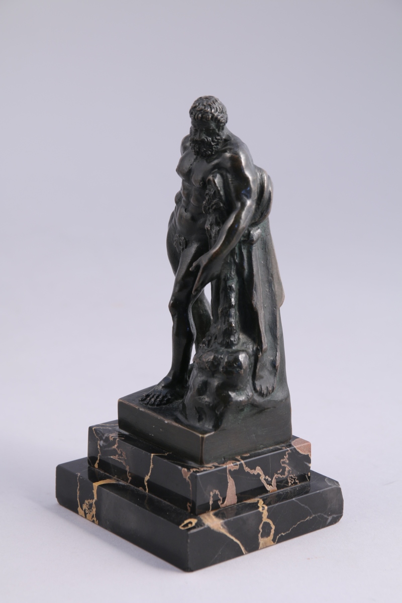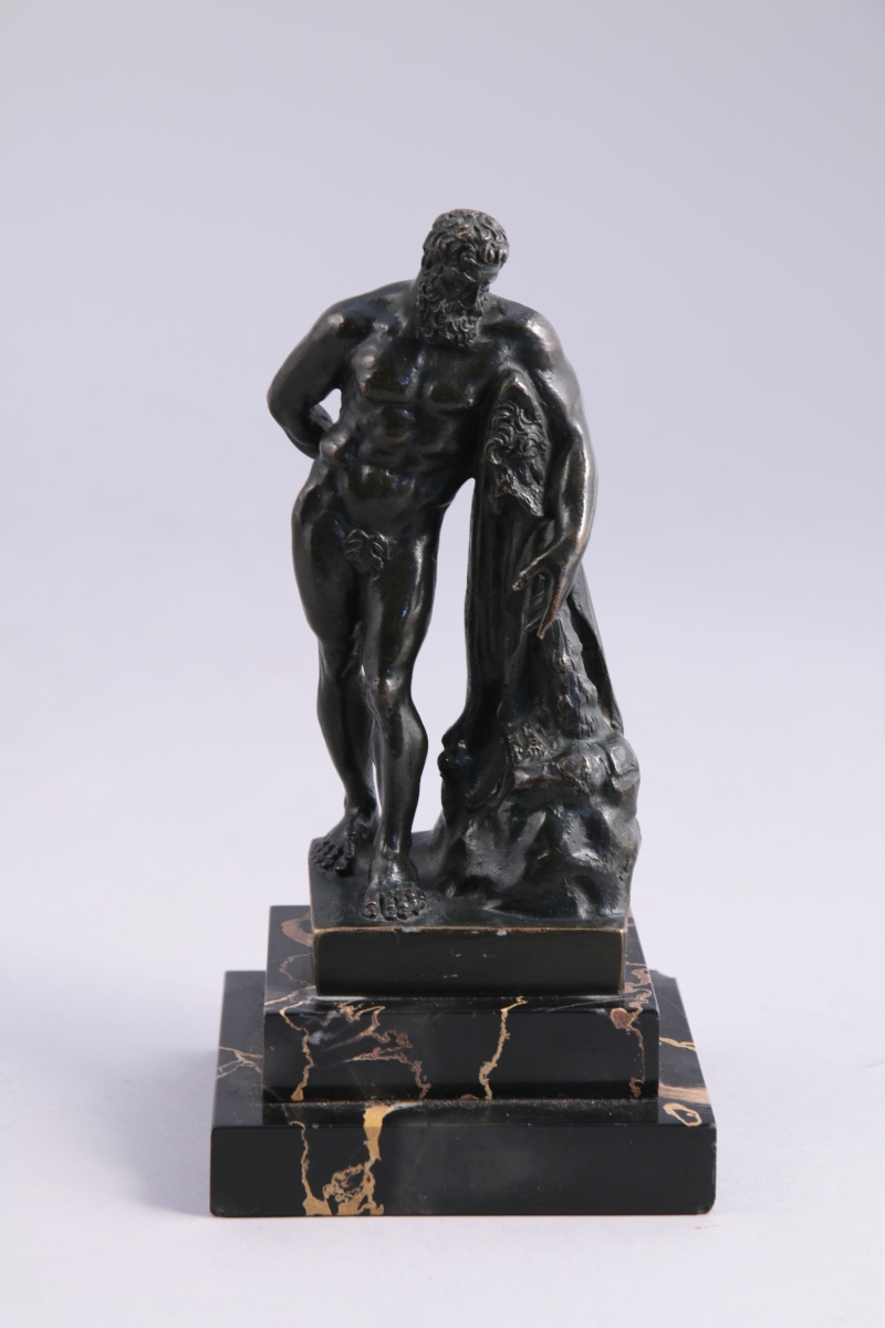 HERCULE FARNÈSE en bronze à patine brune reposant sur une terrasse étagée en marbre noir veiné.
