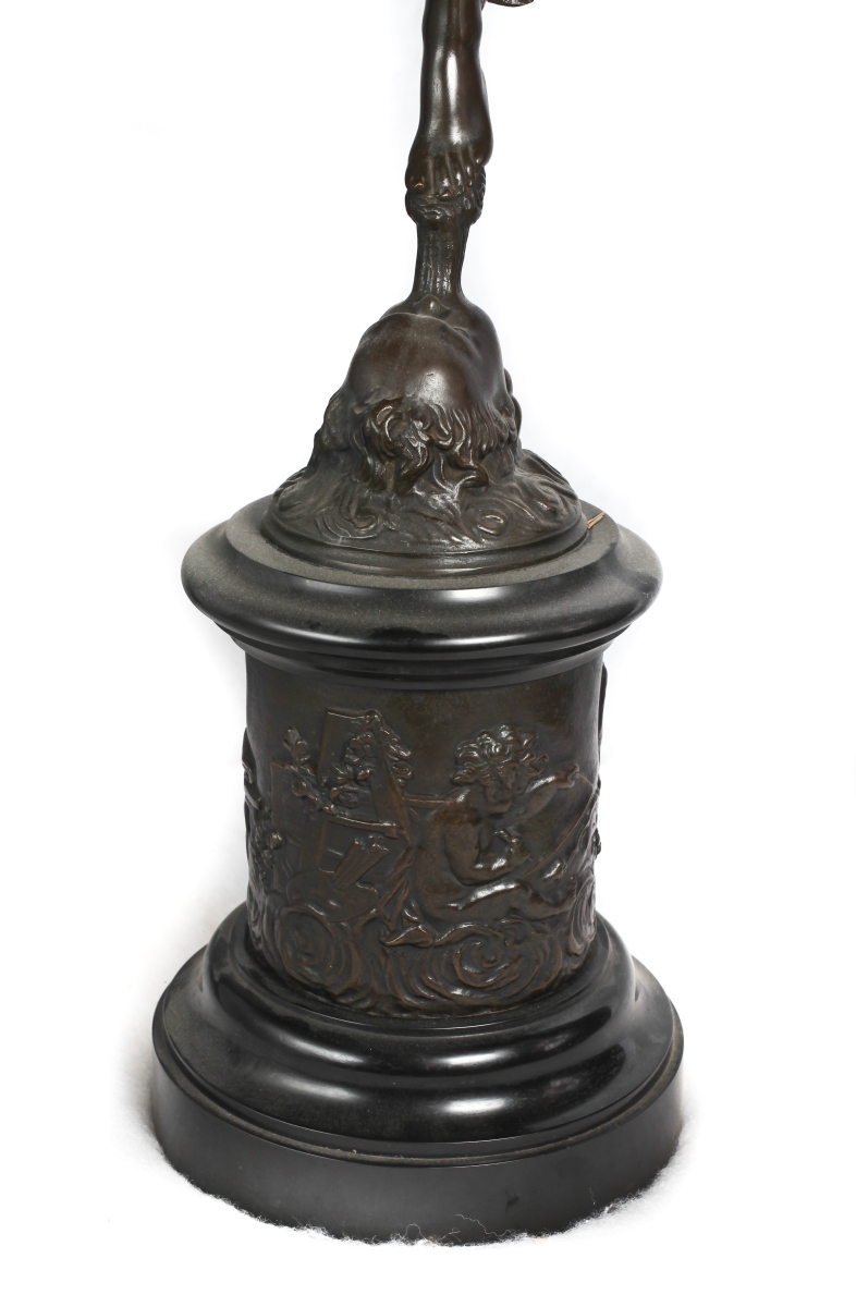 Bronze patiné, sur son socle circulaire en bronze patiné orné de puttis sculpteurs.