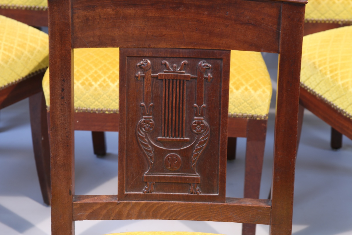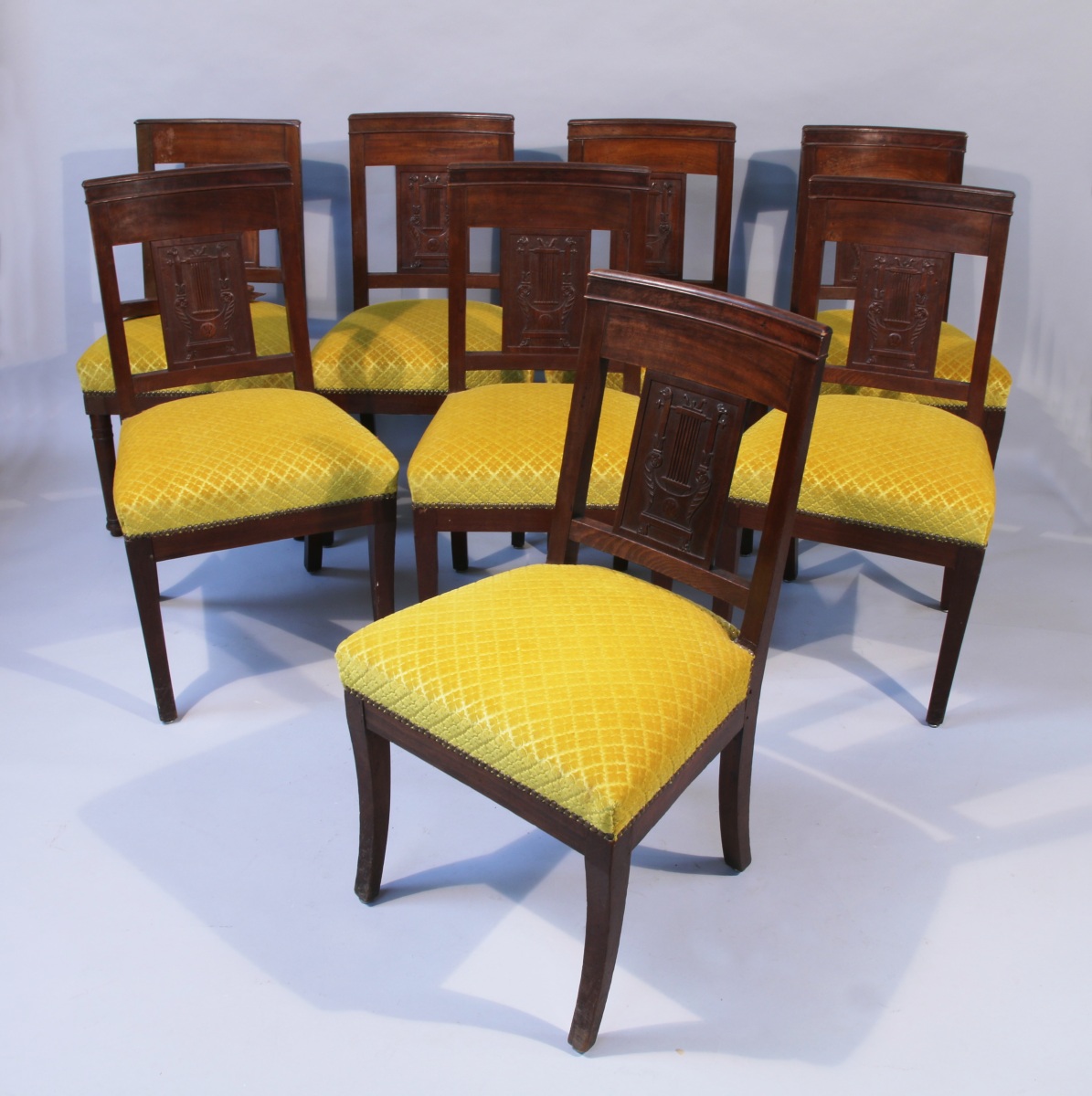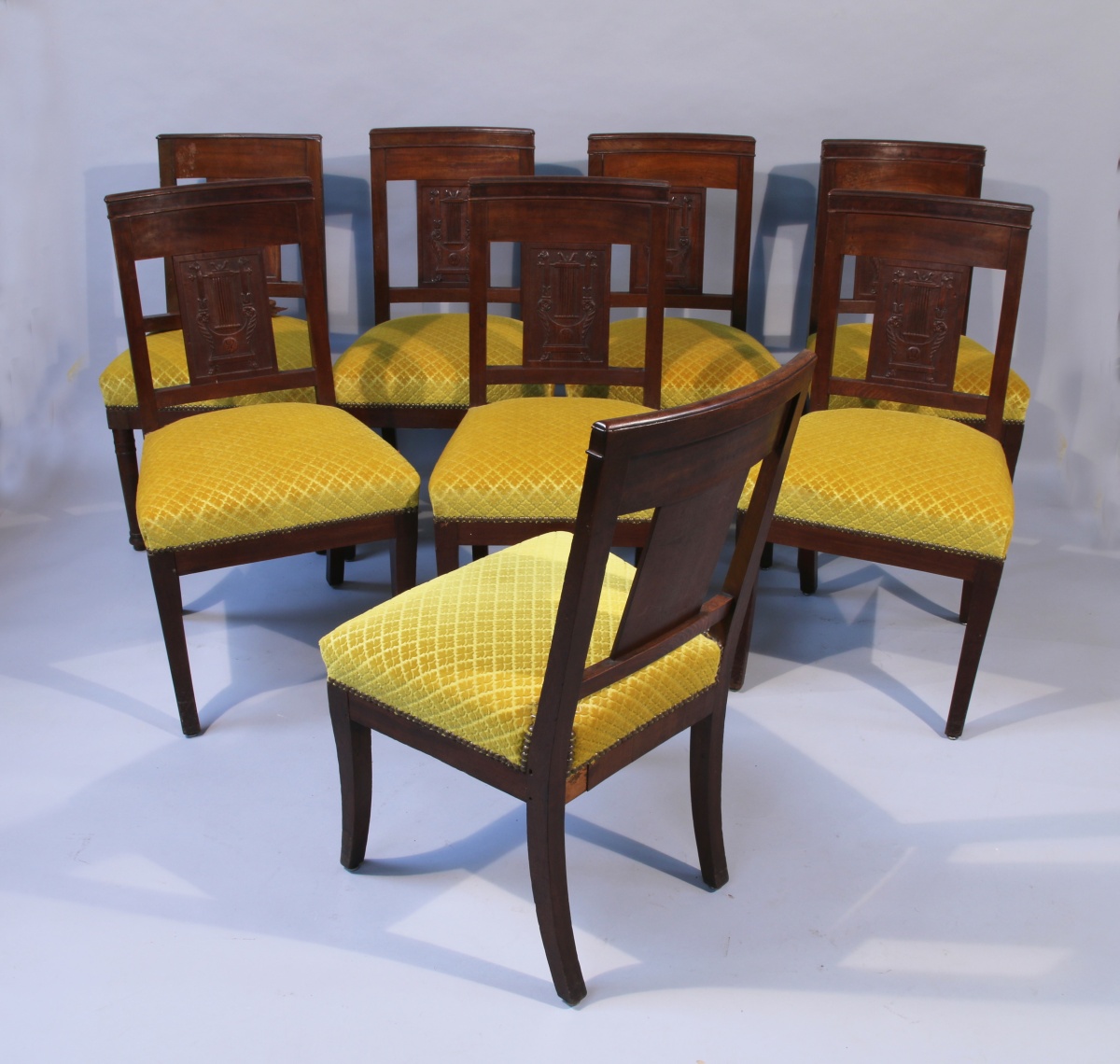 Belle SUITE de 8 CHAISES de SALLE à MANGER en acajou et placage d'acajou, dossier droit à bandeau orné d'une lyre. Les pieds antérieurs en balustre, pieds postérieurs en sabre. Garniture de velours jaune.