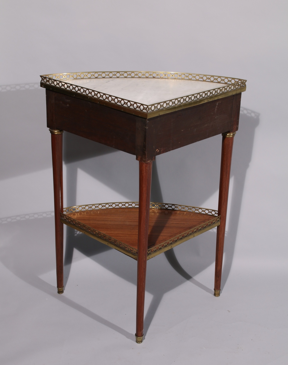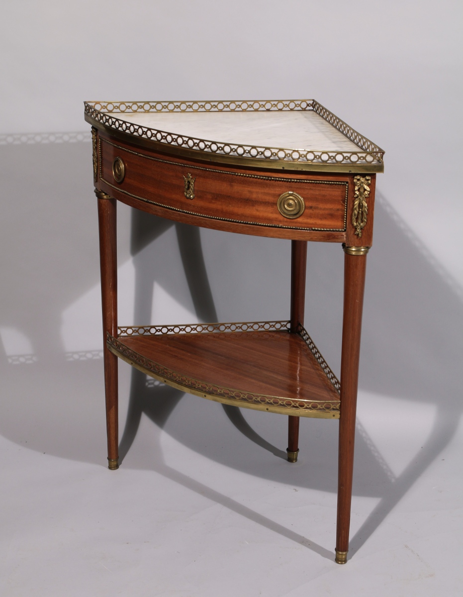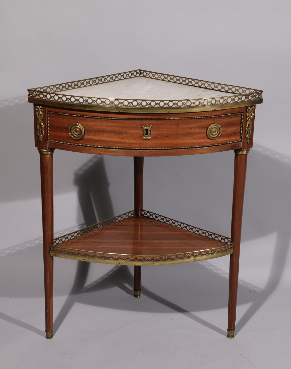 ENCOIGNURE en acajou et placage d'acajou. Elle ouvre par un tiroir en ceinture et repose sur trois pieds fuselés de section ronde réunis par un plateau d'entretoise. Garniture de bronzes dorés tels que galeries ajourées d'entrelacs, chutes d'angles de style néoclassique, entrée de serrure feuillagée, poignées mobiles ornées de couronnes de laurier, rais de perles, chapiteau et bouts de pied.