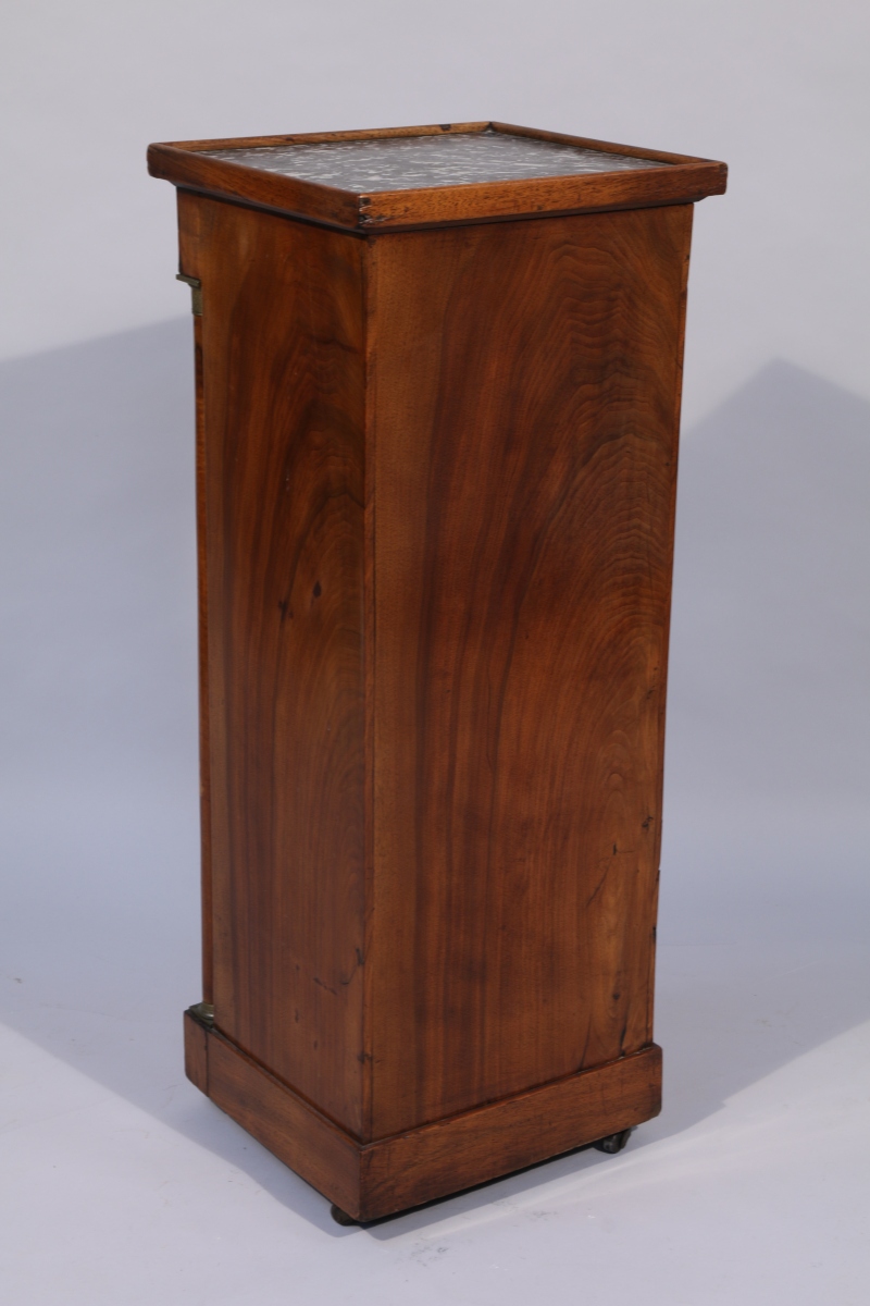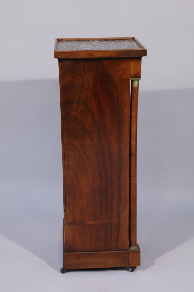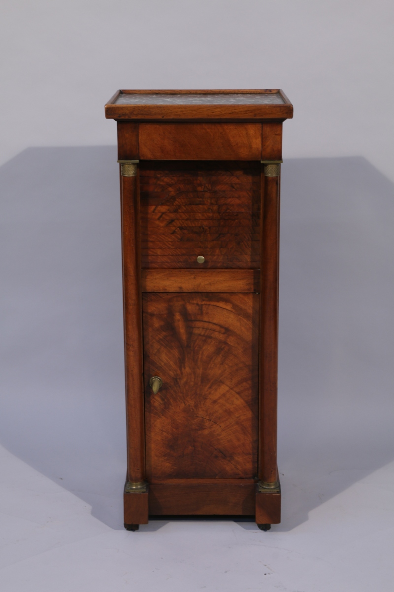 CHEVET de forme rectangulaire en acajou et placage d'acajou. La façade à colonnes détachées à chapiteaux et bases de bronze, ouvre à un volet à lattes et un vantail. Le piètement en plinthe repose sur quatre roulettes. Il est coiffé d'un marbre Saint-Anne.