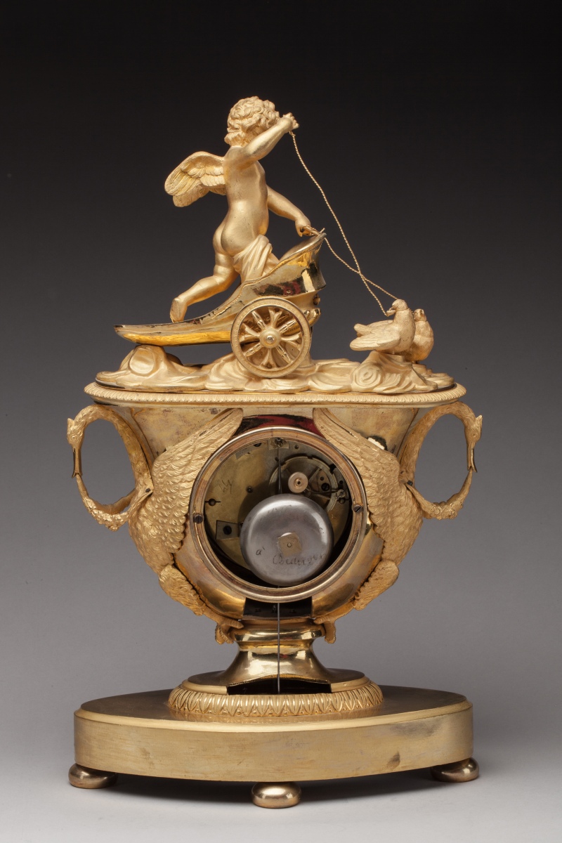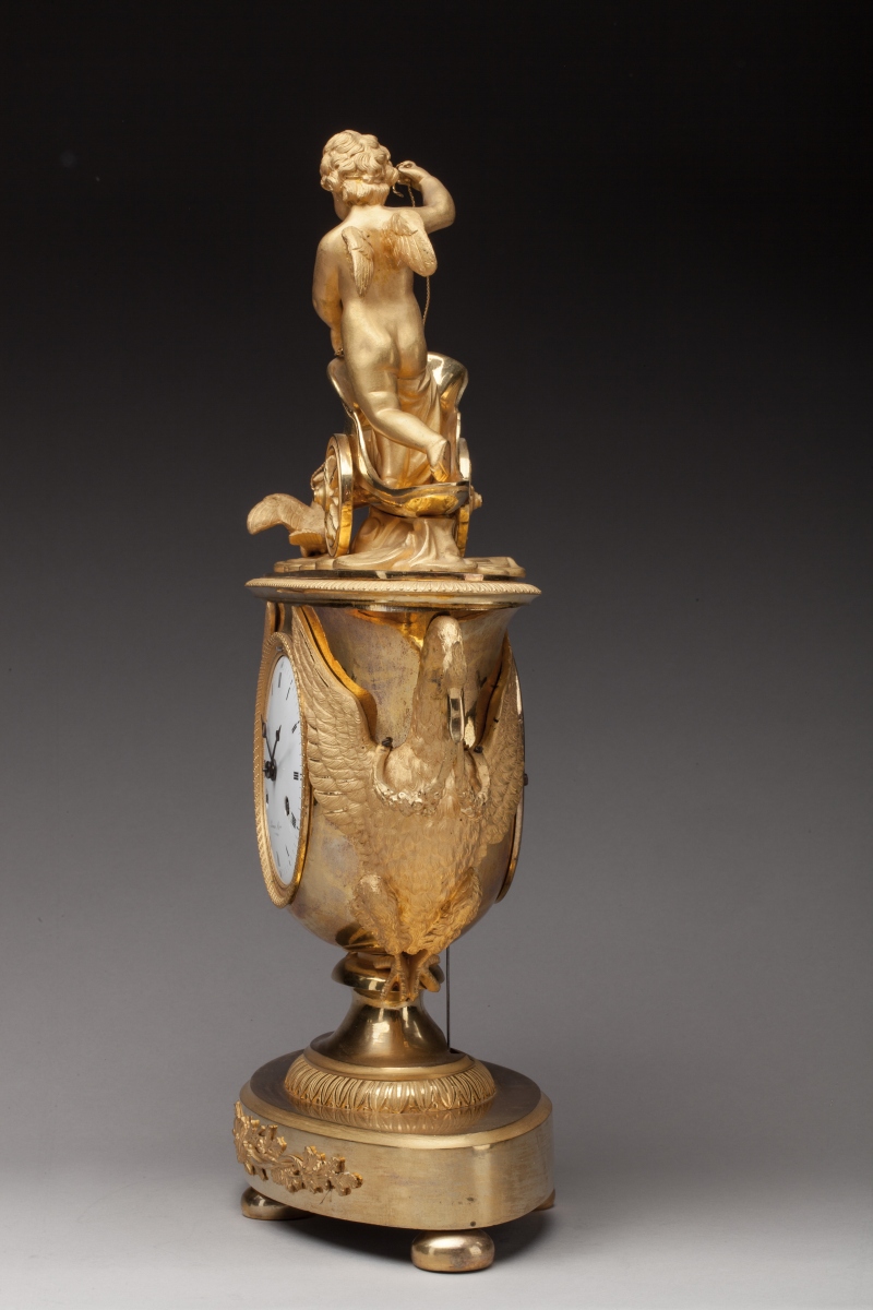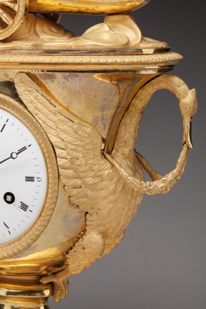 PENDULE À L'AMOUR adoptant la forme d'un vase en bronze ciselé et doré. À l'amortissement, un amour ailé se dresse sur un char tiré par deux colombes. Le cadran est flanqué de deux cygnes aux ailes déployées formant anses et tenant dans leur bec une guirlande de fleurs. Une frise de fleurs de lotus ceint le piédouche supportant la caisse. La pendule repose sur une terrasse ovale centrée d'un trophée de chasse. Le cadran en émail blanc indique les heures en chiffres romains et les quarts d'heure en chiffres arabes. Mouvement signé "Lemoine Mcien A PARIS".