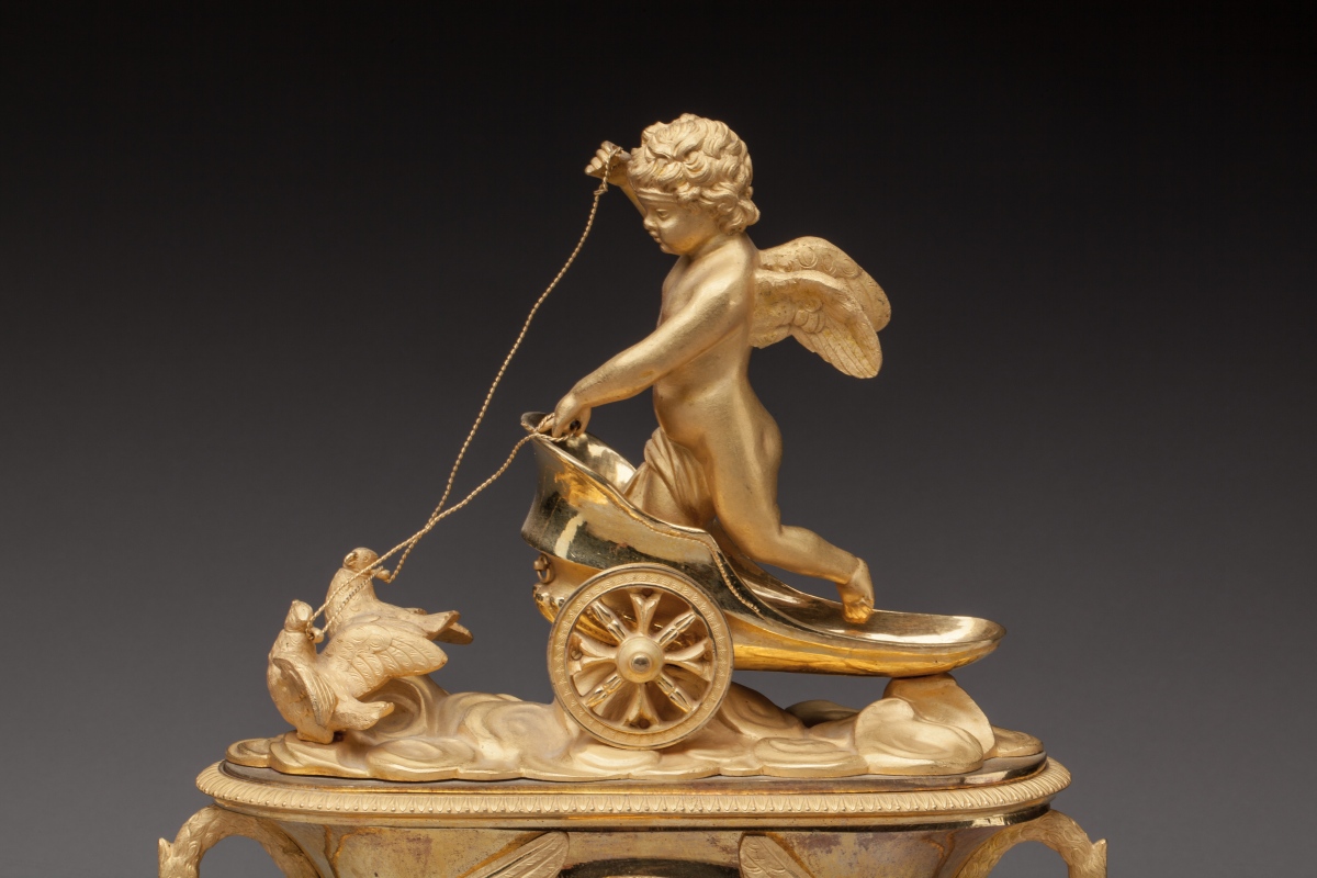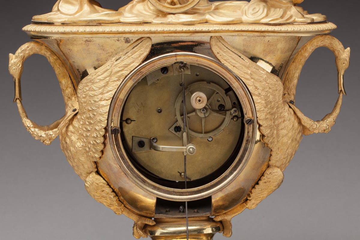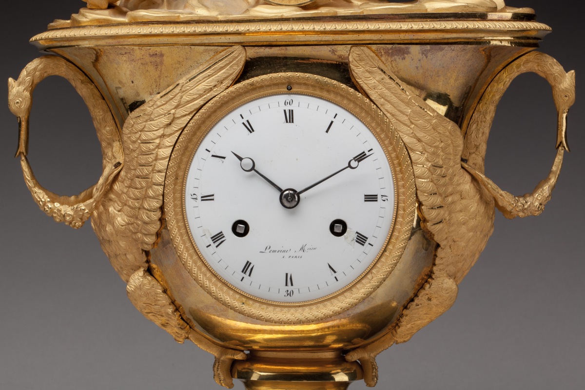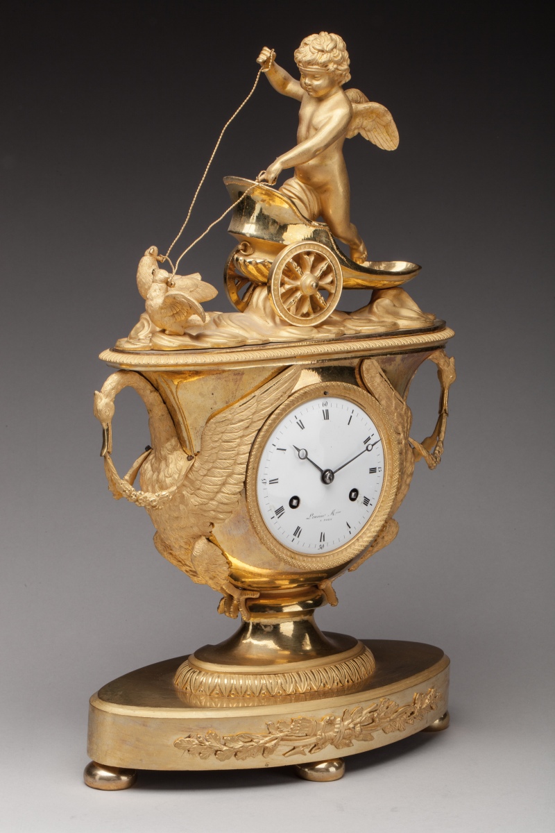 PENDULE À L'AMOUR adoptant la forme d'un vase en bronze ciselé et doré. À l'amortissement, un amour ailé se dresse sur un char tiré par deux colombes. Le cadran est flanqué de deux cygnes aux ailes déployées formant anses et tenant dans leur bec une guirlande de fleurs. Une frise de fleurs de lotus ceint le piédouche supportant la caisse. La pendule repose sur une terrasse ovale centrée d'un trophée de chasse. Le cadran en émail blanc indique les heures en chiffres romains et les quarts d'heure en chiffres arabes. Mouvement signé "Lemoine Mcien A PARIS".