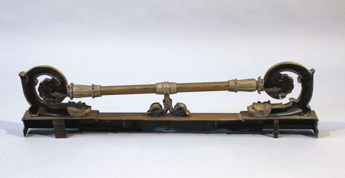 BARRE DE FOYER en bronze à décor d'une frise de grecques flanquée de deux têtes de lion à large enroulement feuillagé. Traces de dorure.