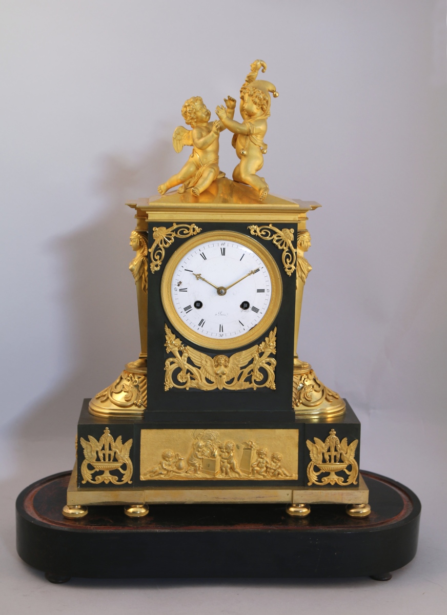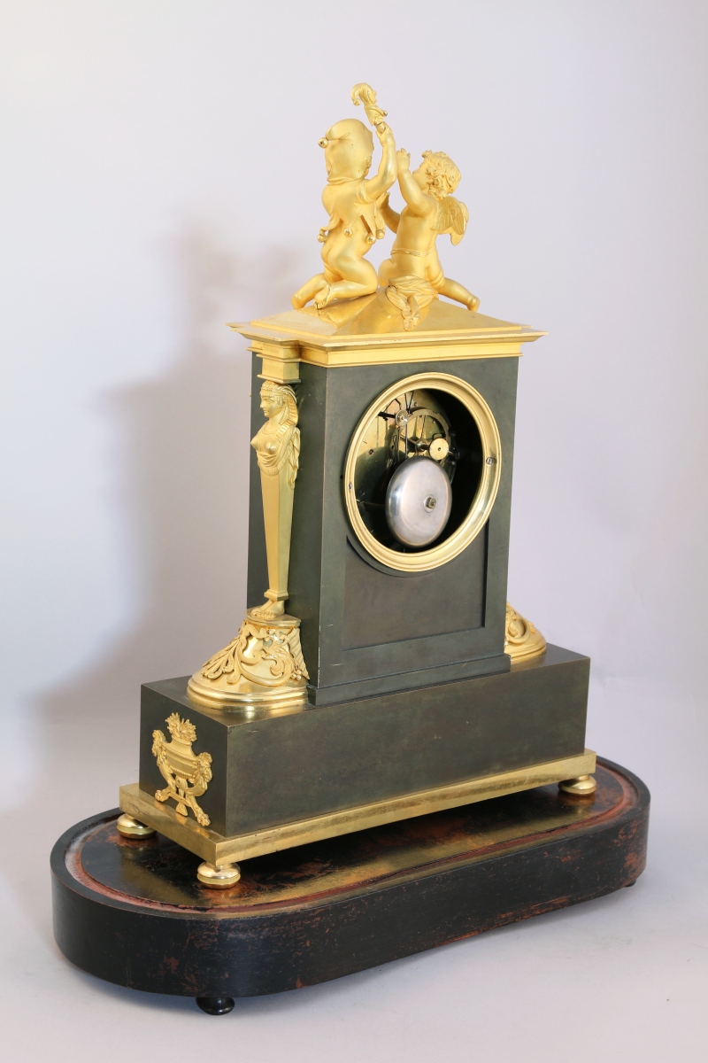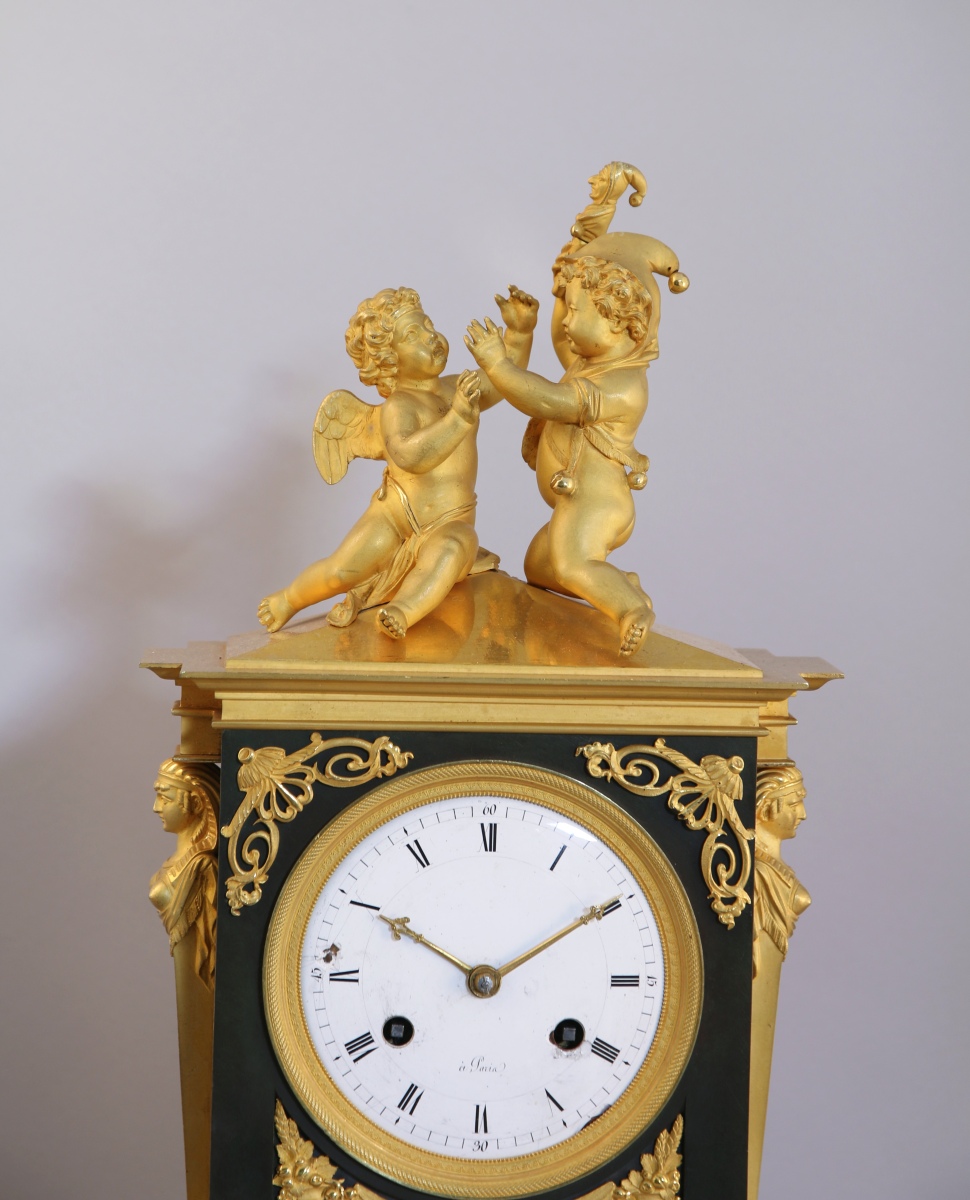 PENDULE BORNE aux CHÉRUBINS en bronze ciselé et doré au mat et au brillant. Le cadran émaillé blanc indique les heures en chiffres romains et les quarts en chiffres arabes. La pendule reçoit une riche ornementation de bronze tels que deux enfants jouant avec un hochet à l'amortissement, des cariatides d'égyptiennes en gaine. Elle repose sur une base rectangulaire à six pieds en boule aplatie. Mouvement à fil.