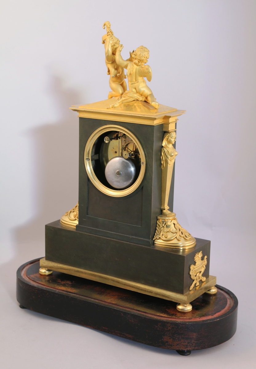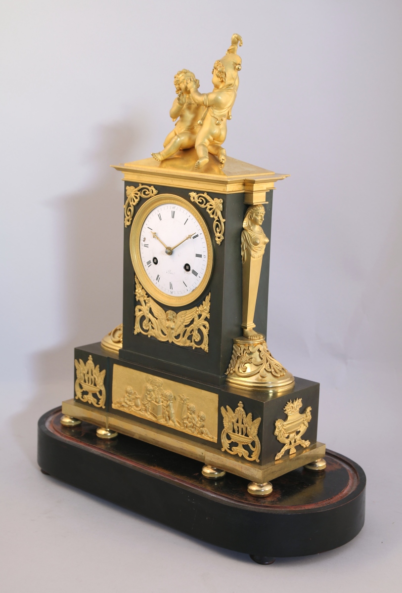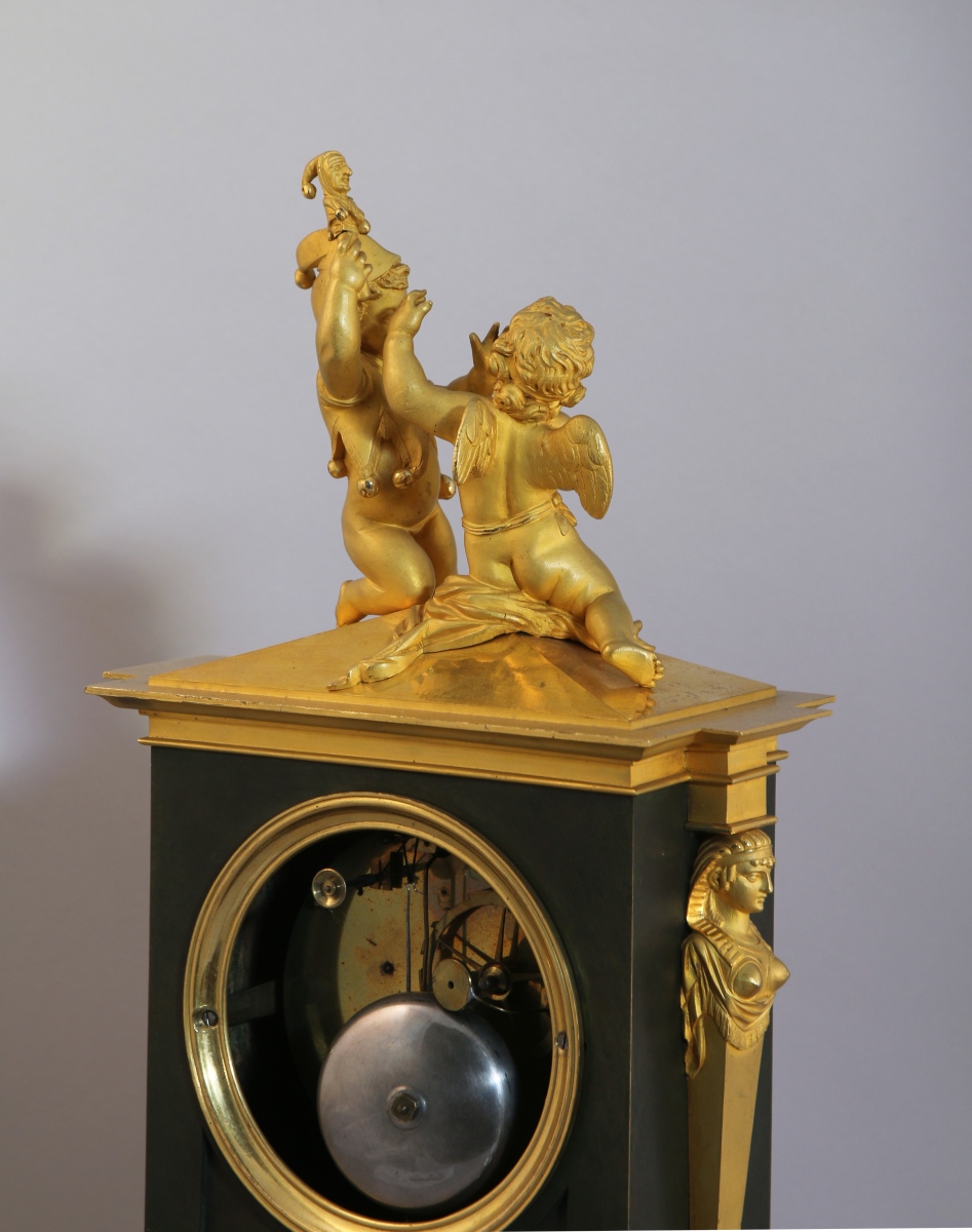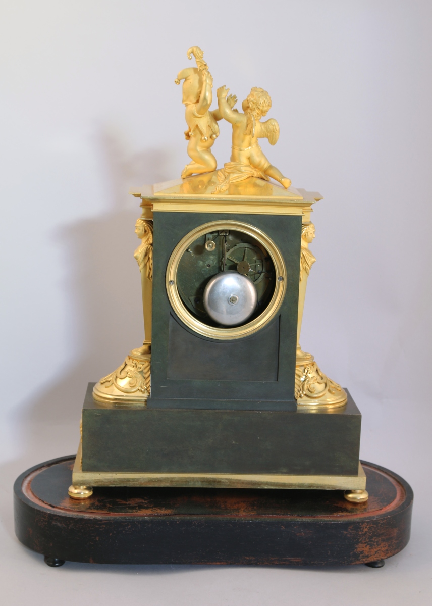 PENDULE BORNE aux CHÉRUBINS en bronze ciselé et doré au mat et au brillant. Le cadran émaillé blanc indique les heures en chiffres romains et les quarts en chiffres arabes. La pendule reçoit une riche ornementation de bronze tels que deux enfants jouant avec un hochet à l'amortissement, des cariatides d'égyptiennes en gaine. Elle repose sur une base rectangulaire à six pieds en boule aplatie. Mouvement à fil.