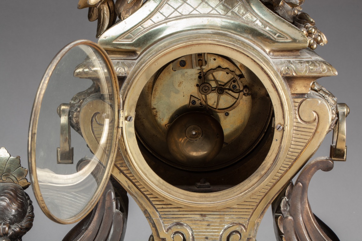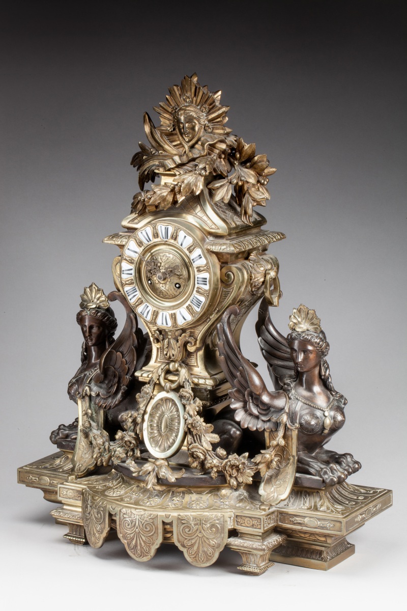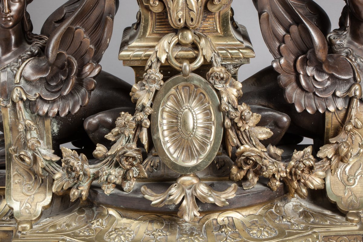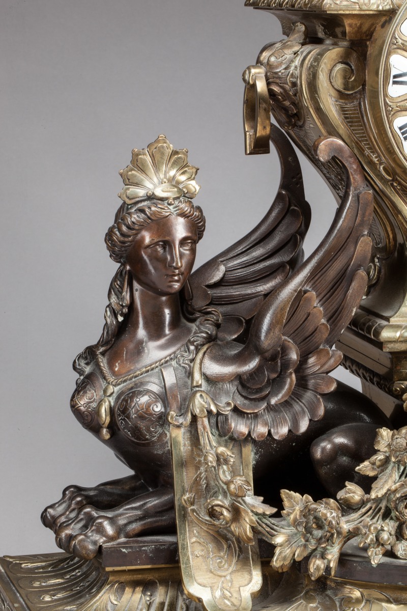 Importante PENDULE DE CHEMINÉE AUX SPHINGES en bronze de deux tons, mat et brillant. La partie centrale en balustre à anses accueille le cadran à cartouches émaillés indiquant les heures en chiffres romains. Elle est ornée à l'amortissement d'un masque d'Apollon agrémenté de palmes et de guirlandes de laurier. En partie inférieure, elle est flanquée de deux sphinges accroupies, costumées et couronnées d'une palmette. Un ombilic à fleuron encadré de guirlandes de fleurs en partie centrale. Terrasse quadripode de forme oblongue à décrochement central recevant un décor de frises feuillagées et tabliers à palmette. Poinçonnée "ER" à plusieurs reprises.