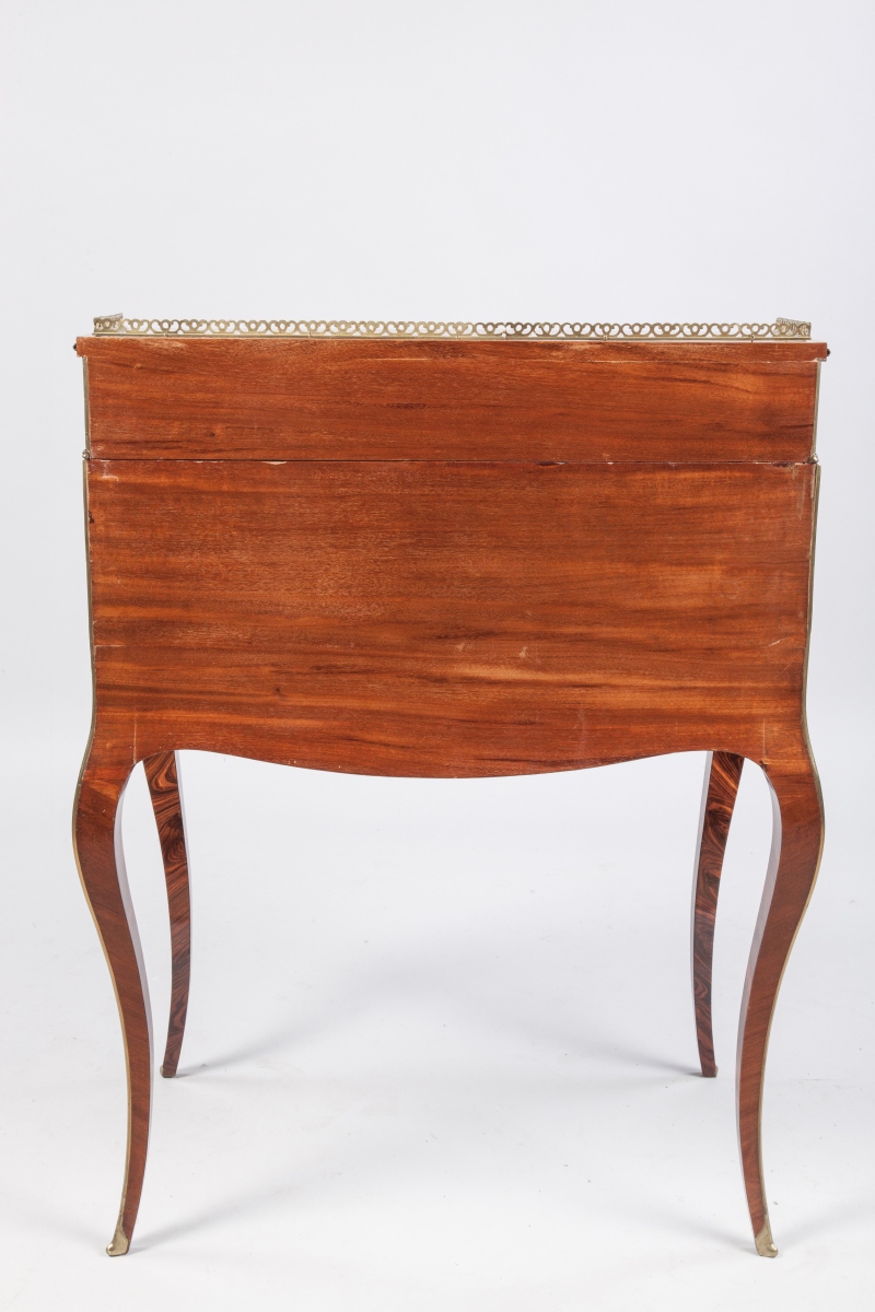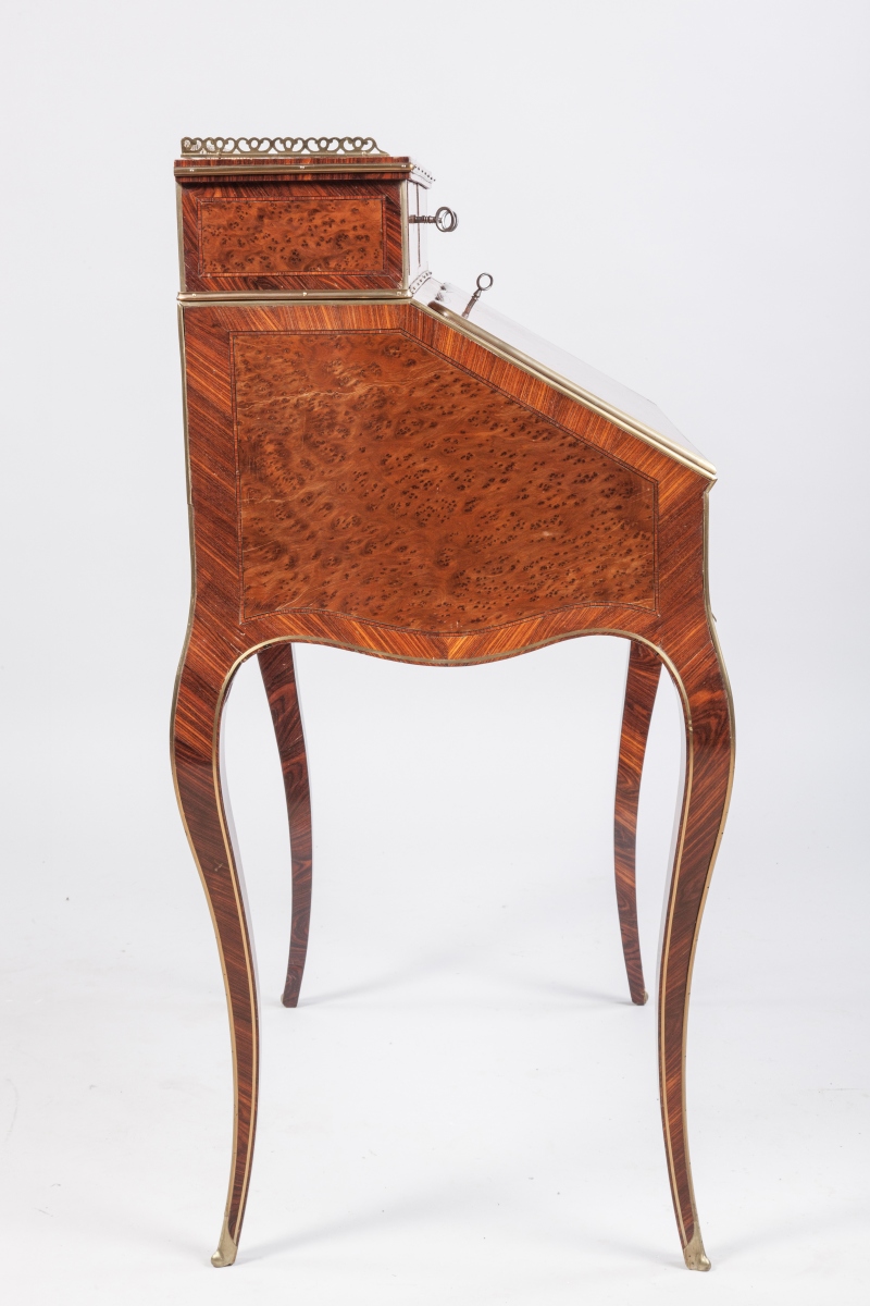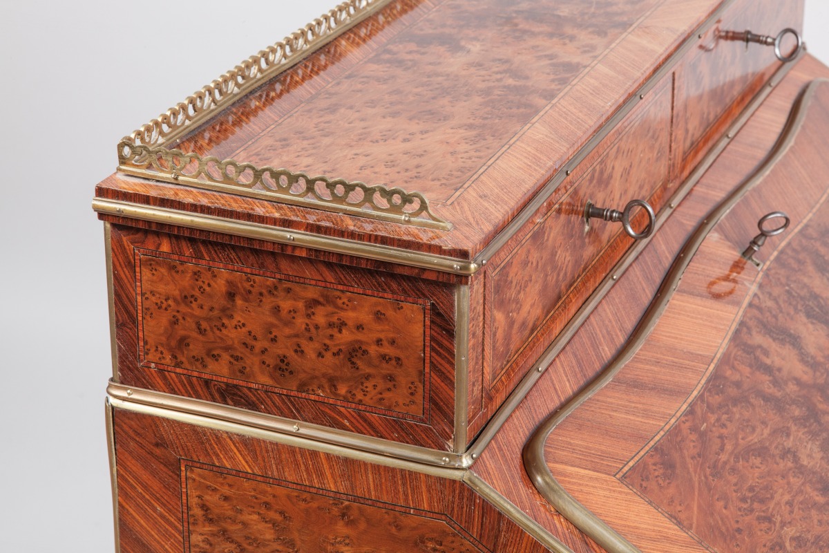 SORMANI. BUREAU DE PENTE en placage toutes faces de ronce de noyer ou loupe d'orme et bois de rose. La partie supérieure en gradin est agrémentée d'une galerie en laiton ajourée d'entrelacs et s'ouvre par deux tiroirs en façade. L'abattant foncé d'un cuir bordeaux découvre un large compartiment garni de trois tiroirs. Leurs façades galbées en placage de loupe d'orme et filets de bois de rose sont ornées de poignées de tirage en rinceaux. Un tiroir en ceinture présente un tablier à la ligne mouvementée. Il repose sur quatre pieds cambrés à pans coupés. Une garniture en filet de laiton souligne les arêtes du meuble et se termine en sabot feuillagé. Signé "P. SORMANI 10, rue Charlot PARIS".