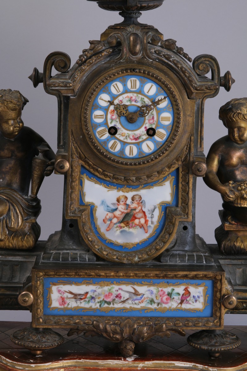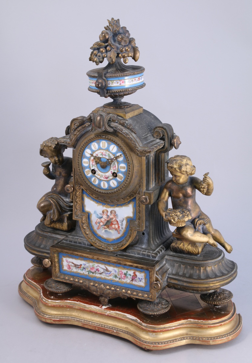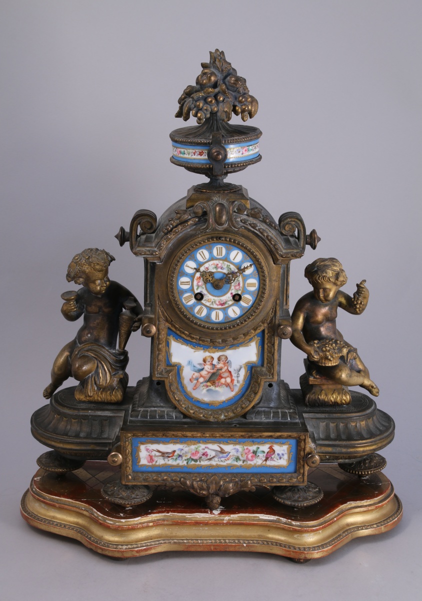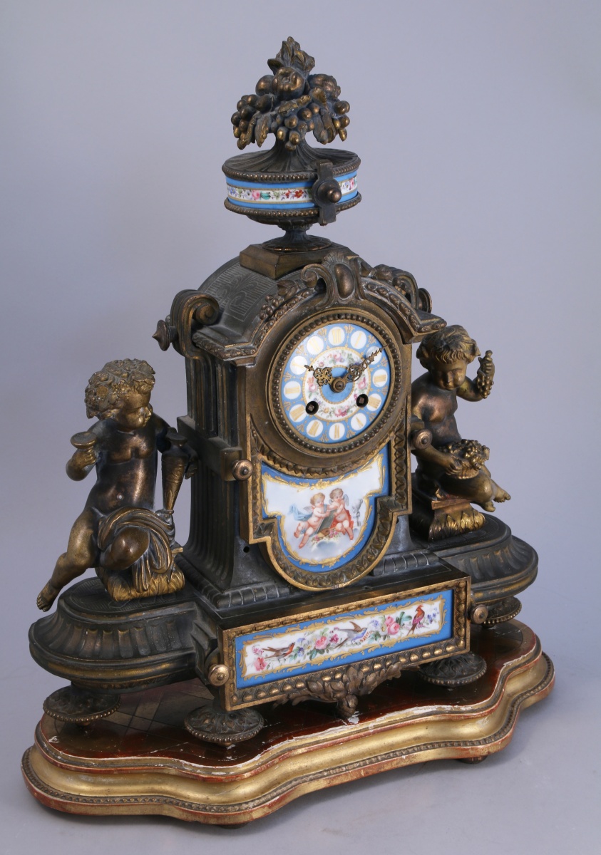 PENDULE aux AMOURS en bronze patiné et doré et PORCELAINE de SÈVRES à fond bleu céleste. A l'amortissement, des fruits jaillissent d'une coupe en bronze, agrémentée en ceinture d'une frise fleurie en porcelaine. La caisse de forme oblongue est surmontée d'une corniche feuillagée centrée d'un médaillon ovale. Le cadran circulaire en porcelaine au motif floral indique les heures en chiffres romains. Sous celui-ci, une plaque trapézoïdale en porcelaine figure deux amours peintres dans un cartouche à décor de rinceaux. La caisse est flanquée de deux amours bachiques en bronze: celui de gauche tient une amphore et une coupe tandis que celui de droite présente une coupe de raisins dont il tient une grappe dans sa main gauche. La pendule repose sur une terrasse centrée en façade d'un cartouche en porcelaine au motif d'oiseaux et de fleurs et reposant sur quatre pieds en boule aplatie.