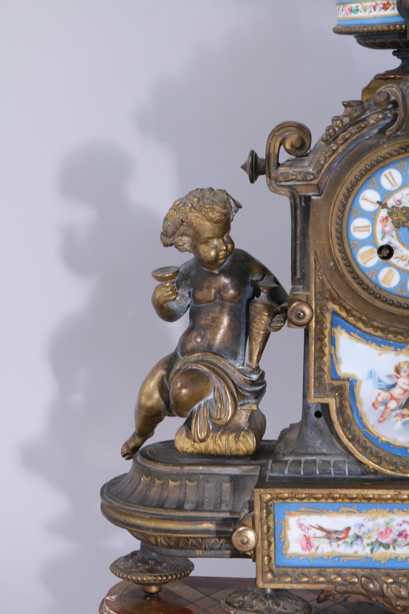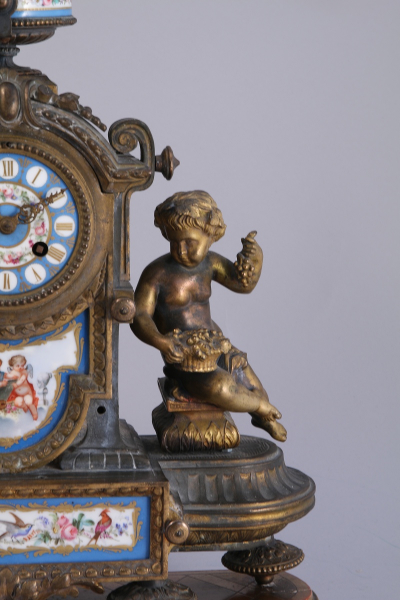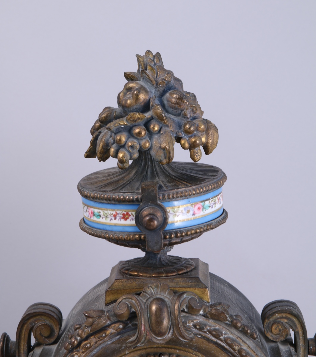 PENDULE aux AMOURS en bronze patiné et doré et PORCELAINE de SÈVRES à fond bleu céleste. A l'amortissement, des fruits jaillissent d'une coupe en bronze, agrémentée en ceinture d'une frise fleurie en porcelaine. La caisse de forme oblongue est surmontée d'une corniche feuillagée centrée d'un médaillon ovale. Le cadran circulaire en porcelaine au motif floral indique les heures en chiffres romains. Sous celui-ci, une plaque trapézoïdale en porcelaine figure deux amours peintres dans un cartouche à décor de rinceaux. La caisse est flanquée de deux amours bachiques en bronze: celui de gauche tient une amphore et une coupe tandis que celui de droite présente une coupe de raisins dont il tient une grappe dans sa main gauche. La pendule repose sur une terrasse centrée en façade d'un cartouche en porcelaine au motif d'oiseaux et de fleurs et reposant sur quatre pieds en boule aplatie.