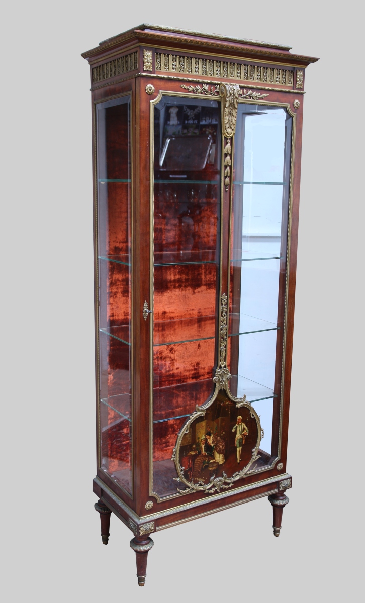 MAJORELLE. VITRINE en acajou ouvrant à une porte vitrée. Cartouche inférieur central orné d'une scène peinte au couple libertin et vieillard consentant. Dessus à doucine. Elle repose sur quatre pieds toupie. Riche ornementation en bronzes finement ciselés et dorés au riche répertoire iconographique fin XVIIIe. Cotés aux vitres biseautées.