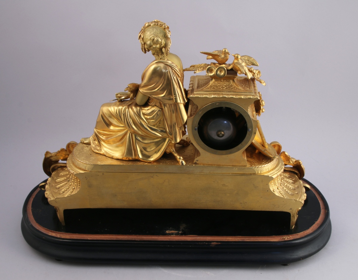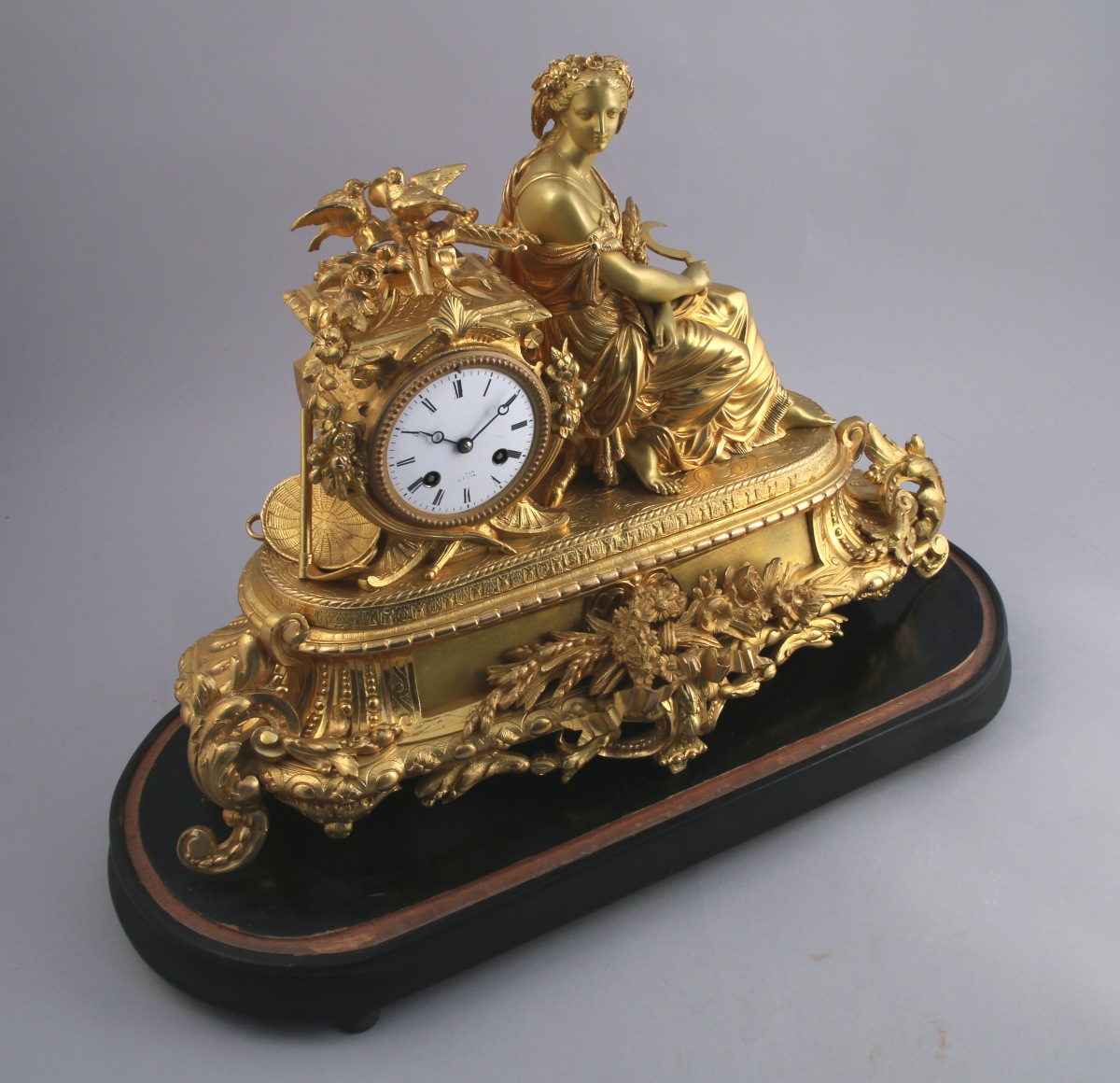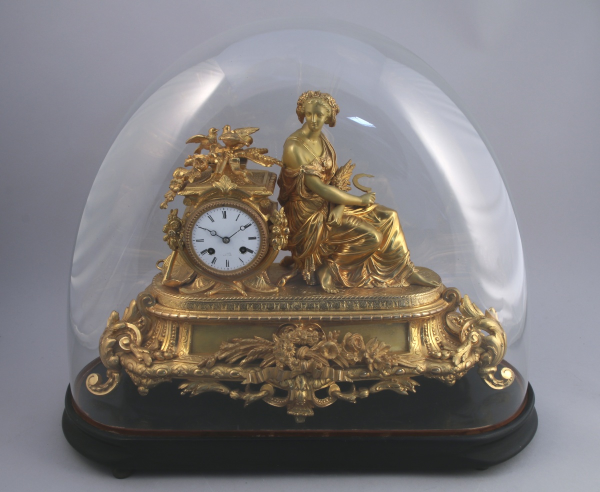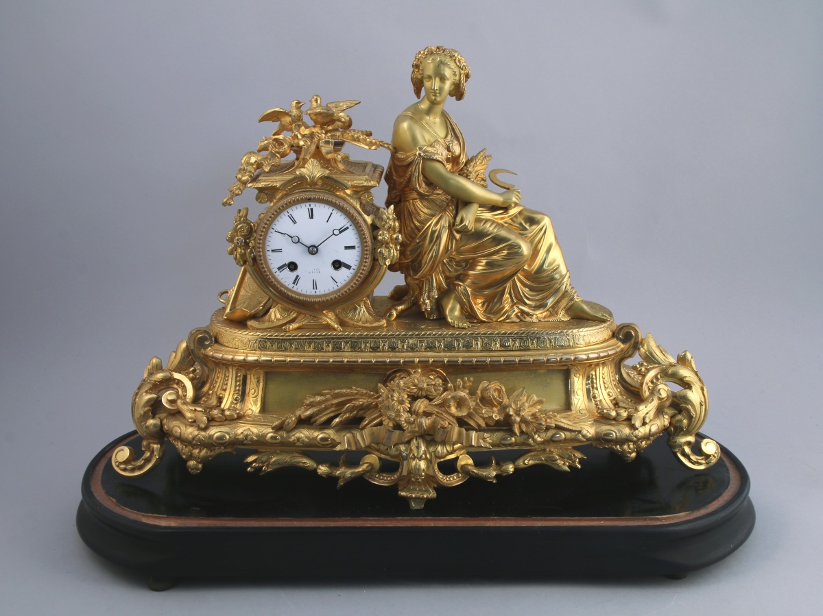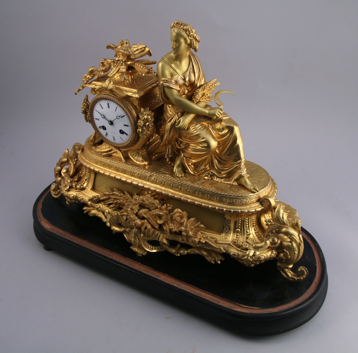 PENDULE en bronze et régule doré et patiné, figurant Démeter tenant une serpe et une gerbe de blé, assise sur un tabouret à pieds de boucs. Elle est flanquée d'une borne surmontée de deux oiseaux, trompettes, épis de blé, rubans et soulignée de cornes d'abondance. Le cadran émaillé blanc indiquant les heures en chiffres romains, signé "...N à Paris". La base oblongue ornée en son centre d'une guirlande de fleurs repose sur cinq pieds. Mouvement à plaque.