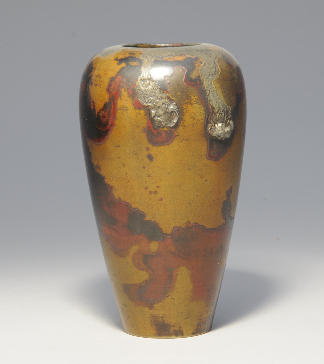 VASE de forme pansue en bronze travail à l'acide de couleur brune, ocre et rouille. Coulures en vaguelettes argentées.