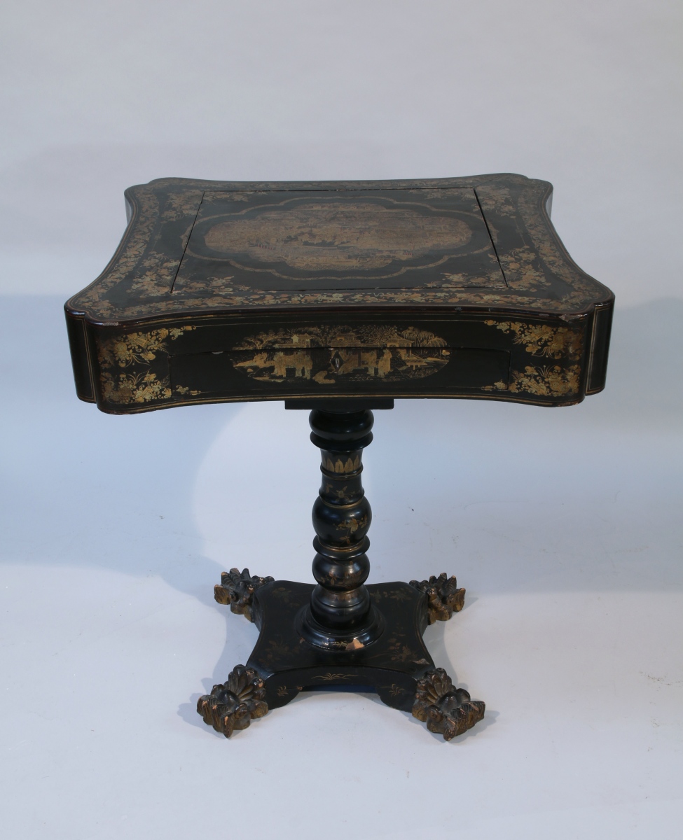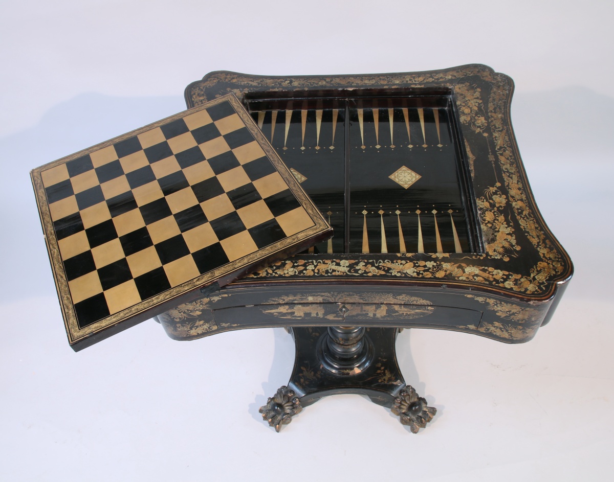 TABLE À JEU de forme rectangulaire en laque à décor or de scènes de palais sur fond noir. Elle ouvre par un tiroir en ceinture et une tablette découvrant un plateau de tric-trac. Piètement à fût balustre reposant sur quatre pieds griffes feuillagés.