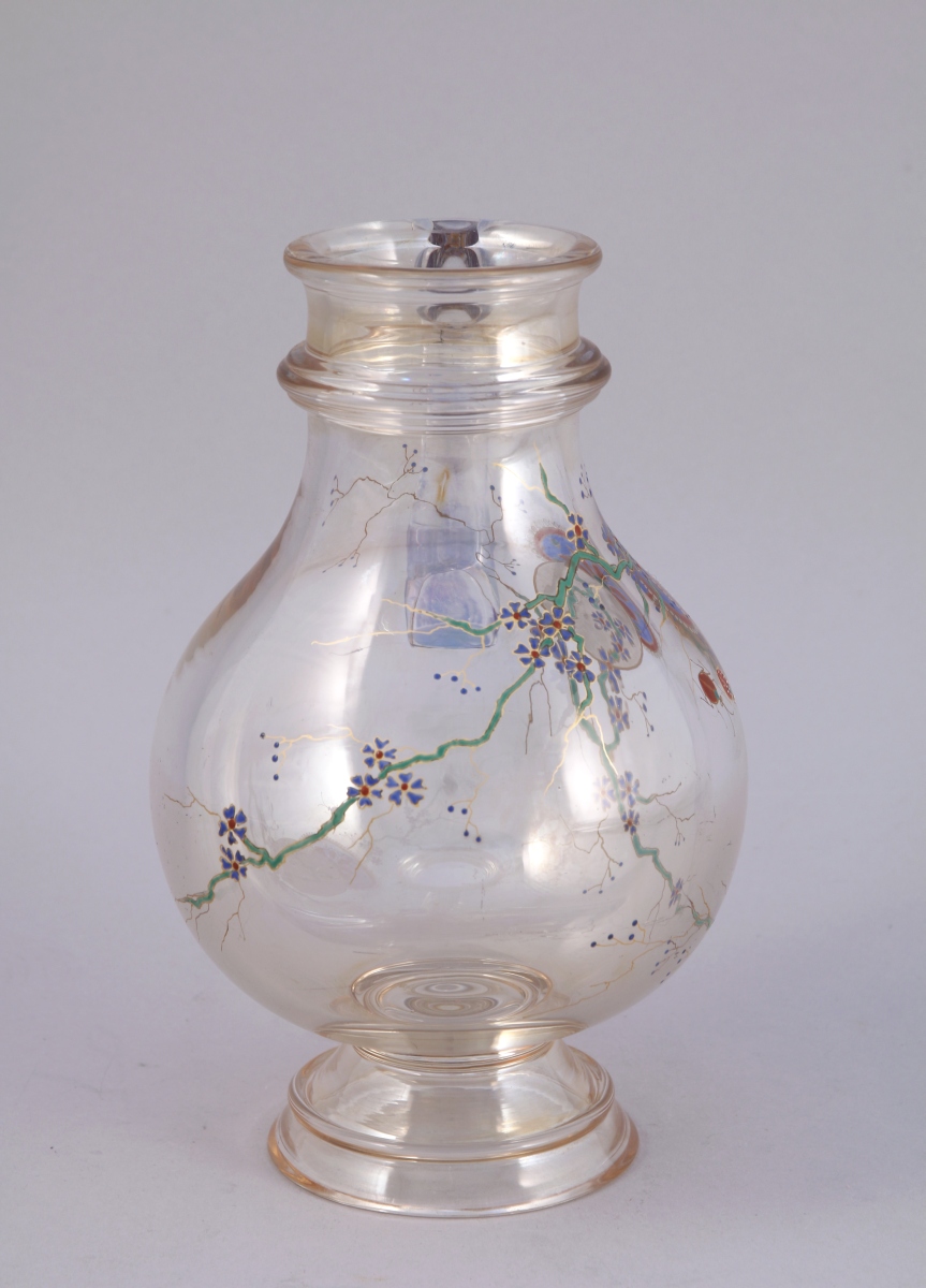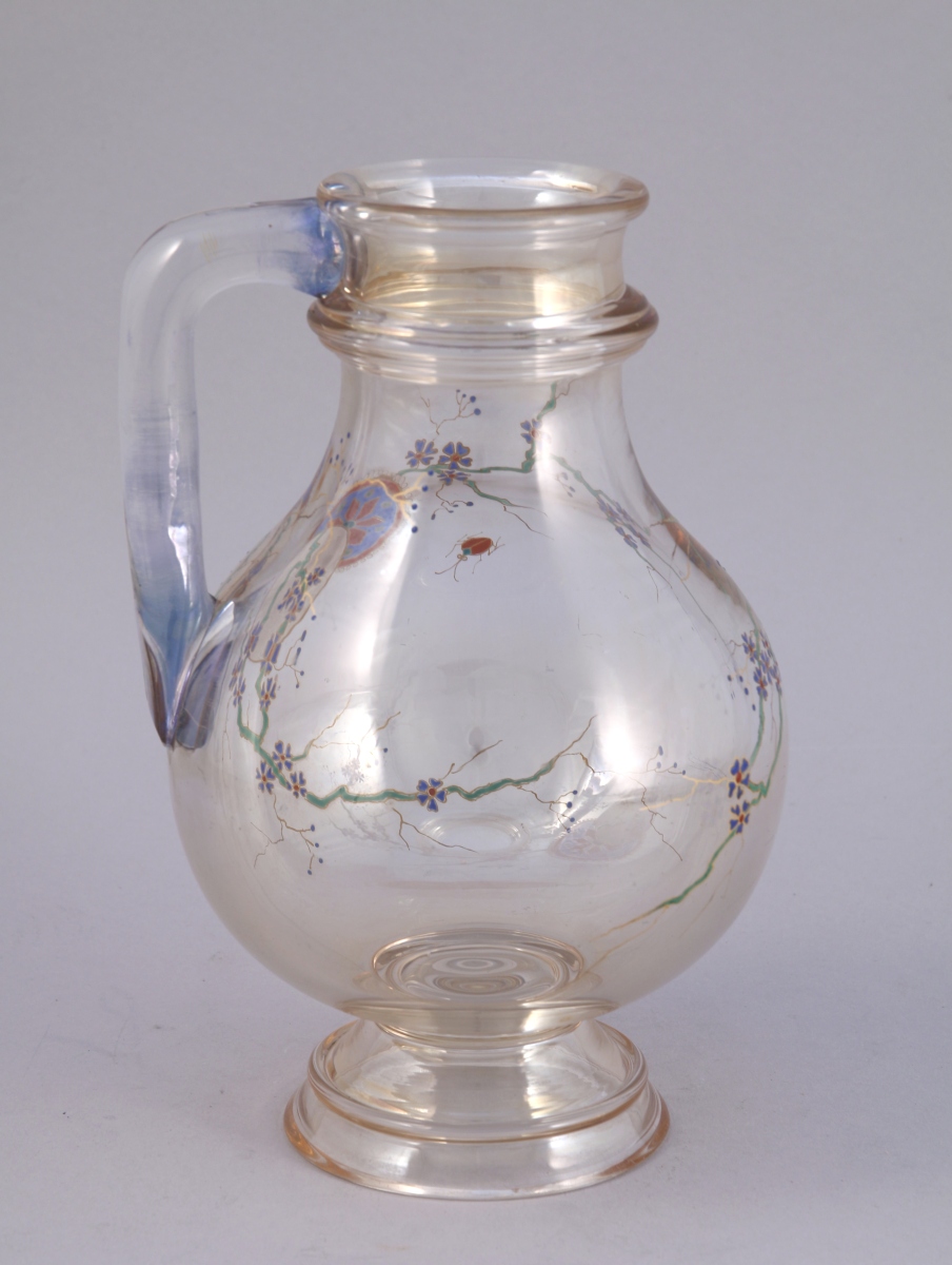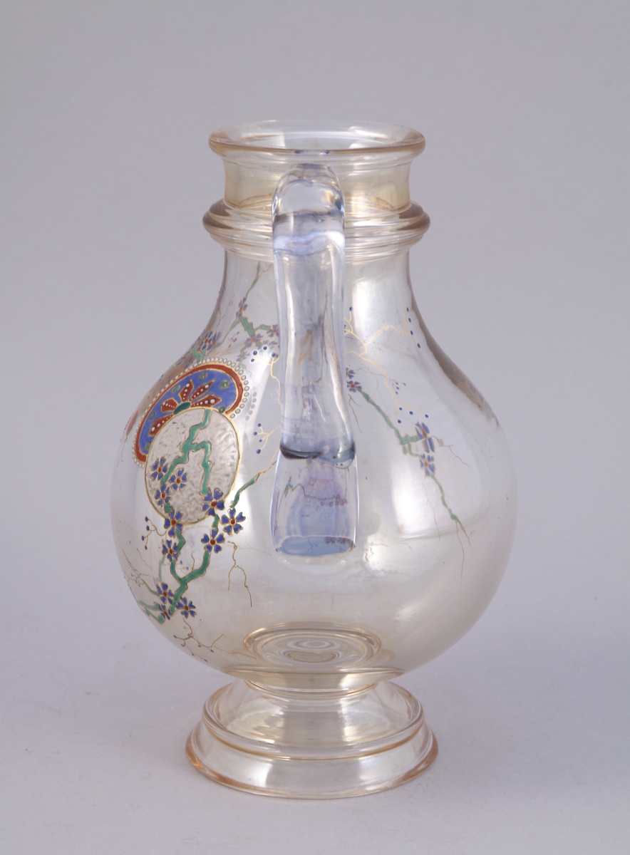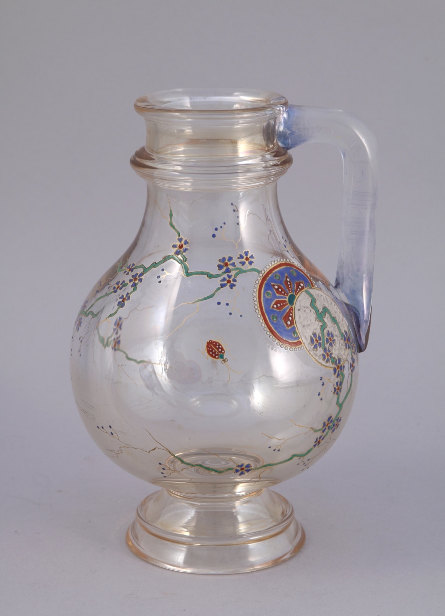 Eugène ROUSSEAU (1827-1890). PICHET en cristal, à panse bombée et col droit à deux anneaux en cristal fumé. Le corps émaillé en léger relief d'un décor japonisant en bleu, rouge, vert et blanc cerclé d'or. Il se compose de deux figures géométriques (circulaire et ovale), de branches fleuries et d'un coléoptère. L'anse coudée en verre clair de lune appliquée. Repose sur un piédouche évasé. Numéroté 418 au stylet, non signé.