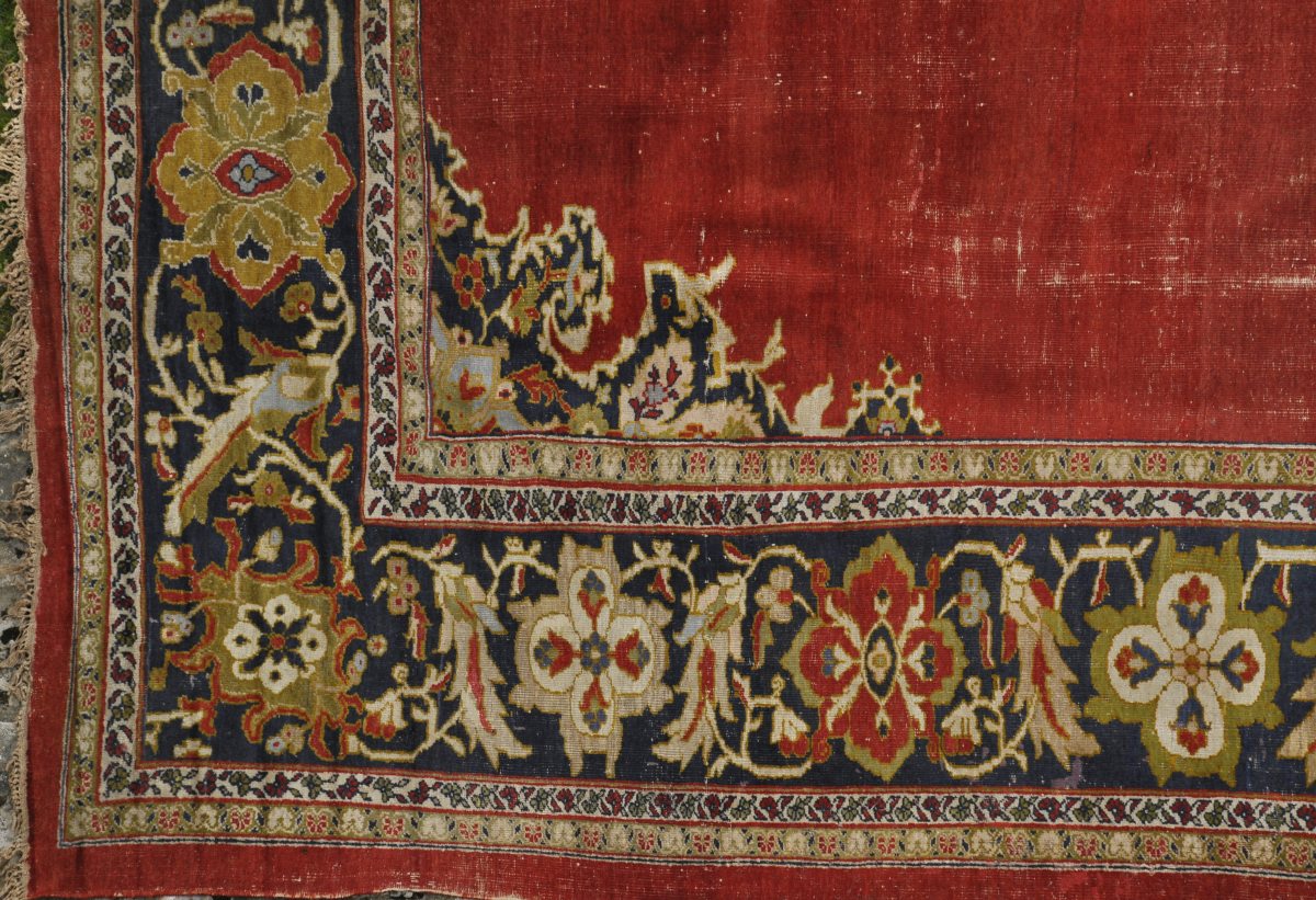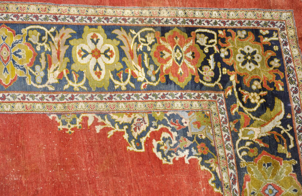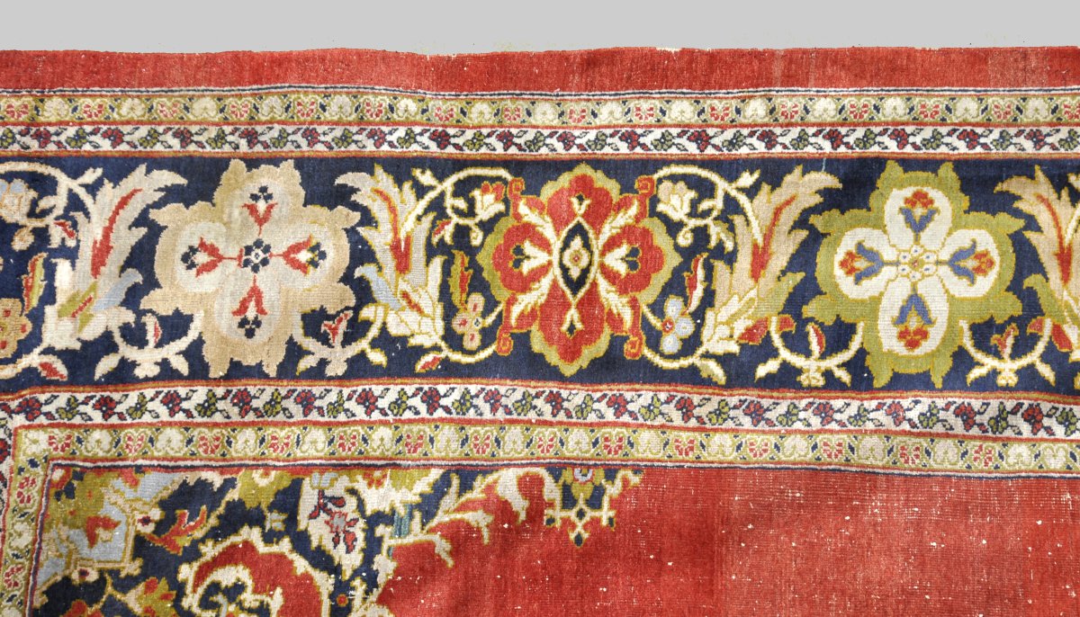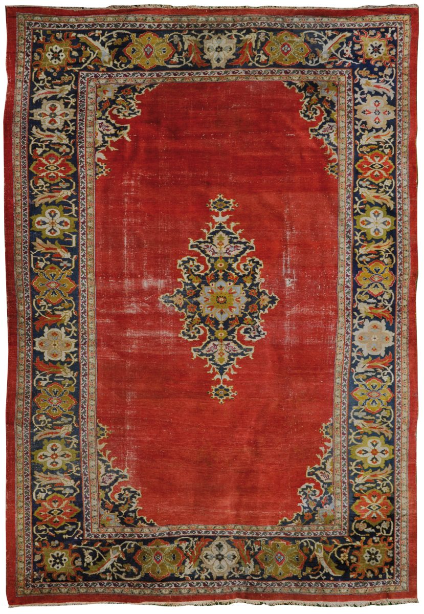 SMYRNE ? Grand TAPIS d'ASIE MINEURE en laine à fond rouge centré d'un petit médaillon et d'écoinçons à fond bleu nuit accueillant un motif floral. Une large bordure à fond bleu nuit est ornée de boteh entrelacés et de médaillons quadrilobés jaunes, verts et rouges. Double contre-bordure crème et verte à frise florale.