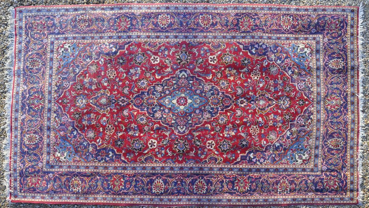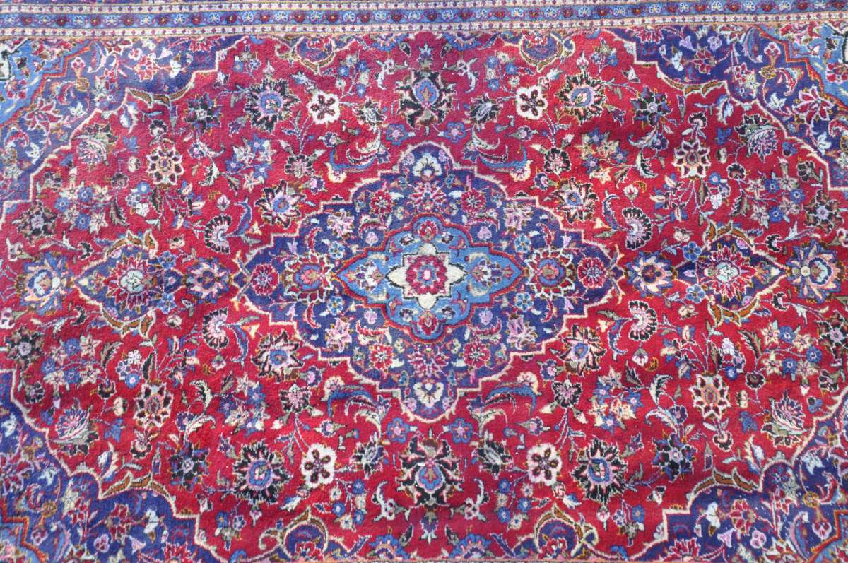 AGRA ? TAPIS D'ORIENT dans le goût d'Agra, en laine à fond rouge à riche décor floral à dominante bleue centré d'une rosace. Bordure à fond bleu flanquée de deux contre-bordures.