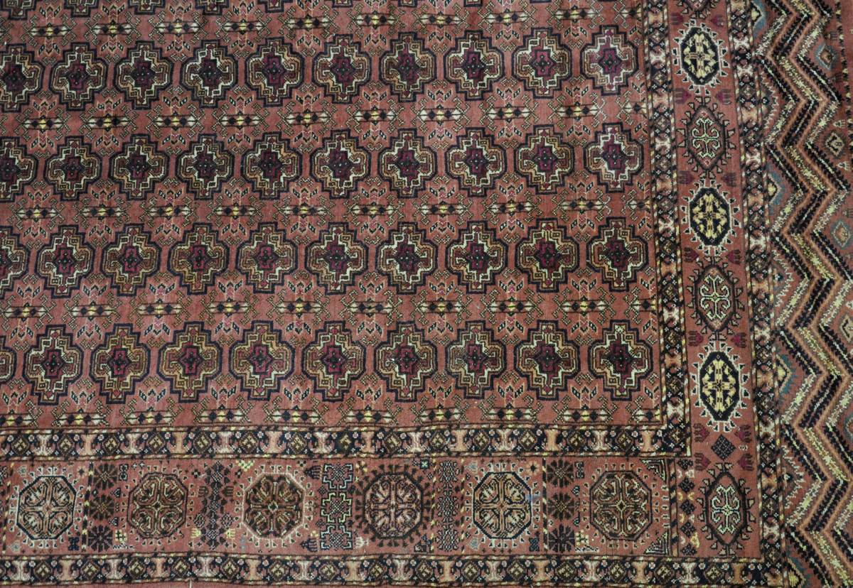 BOUKHARA. TAPIS en laine à fond rouge. Décor de gûhls,...
