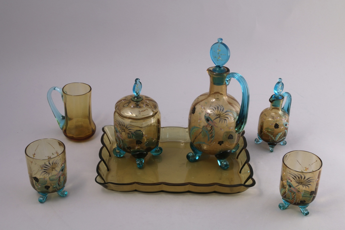 VERRE d'EAU. Service de six pièces en verre modèle dit George Sand à décor émaillé polychrome d'un perroquet branché dans des feuillages. Le service composé d'une carafe, d'un carafon, d'un sucrier, de deux verres et son plateau rectangulaire.