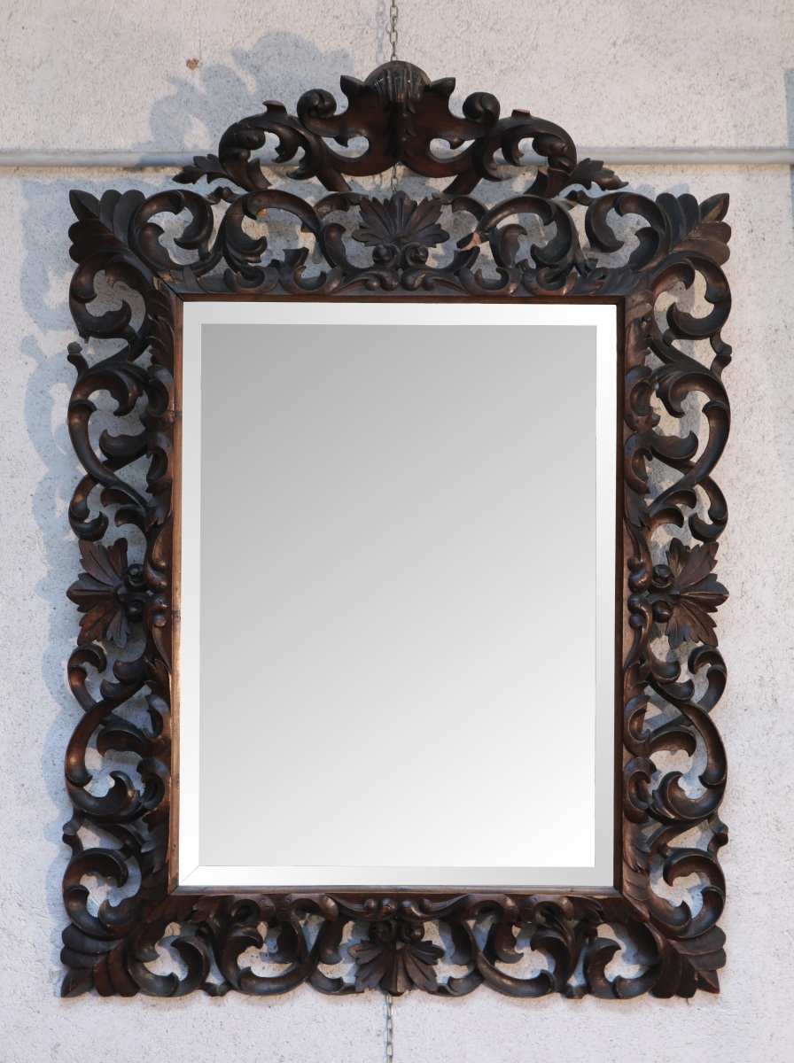 MIROIR de forme rectangulaire en bois sculpté et teinté. Riche décor ajouré d'enroulements feuillagés. Glace biseautée.
