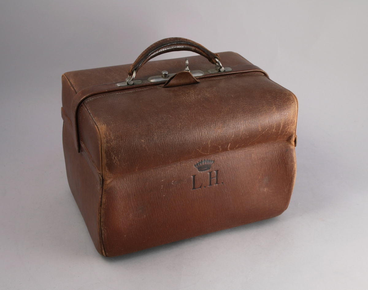 - d'un NÉCESSAIRE de TOILETTE comprenant un ensemble de sept boîtes ou flacons de formes diverses en verre torsadé à bouchon d'argent gravé d'une couronne comtale; trois brosses monogrammées "LH"; un peigne; un miroir (brisé); un fer à friser; une boîte à lumière; un ensemble de neuf petits ustensiles et un chausse-pied monogrammé "LH";