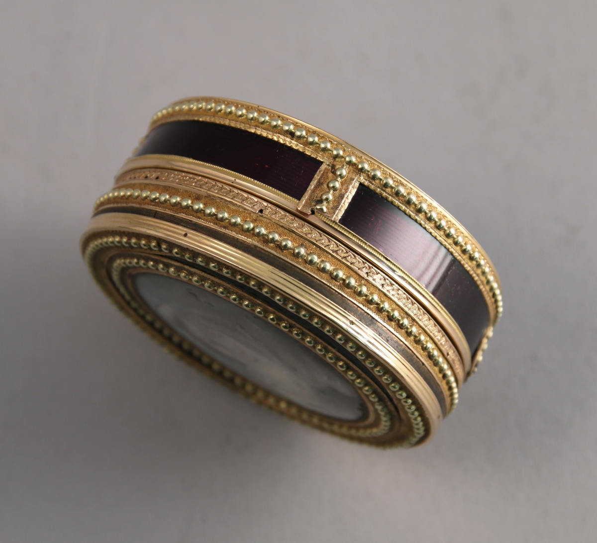 PARIS. BOÎTE de forme circulaire en or de deux tons à décor de rais de perles. Le couvercle ceint d'une miniature de forme ovale figurant un garçonnet coiffé d'un chapeau. Les fonds en émail guilloché violet.