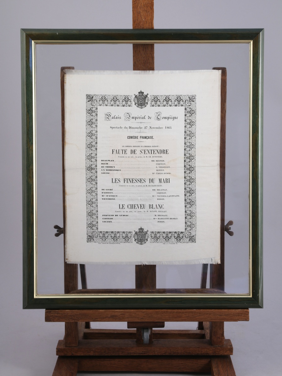 MOUCHOIR en soie imprimé d'un programme théâtral, donné au Palais Impérial de Compiègne le 27 novembre 1864 par la Comédie Française. Les pièces jouées furent "Faute de s'entendre", "Les finesses du mari" et "Le cheveu blanc".