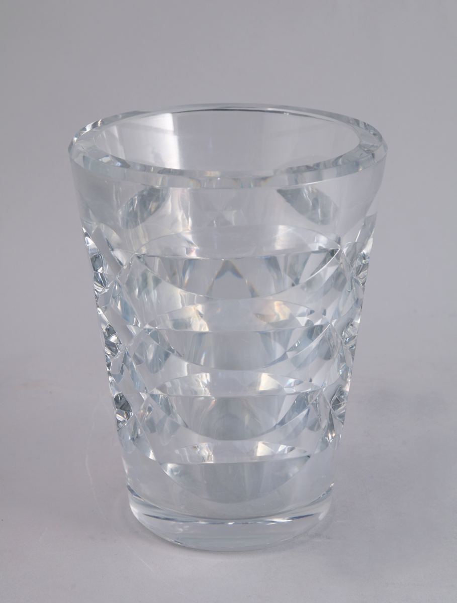 BACCARAT. VASE de forme tronconique en cristal taillé d'un décor géométrique de navettes et étoiles. Cachet. XXe.