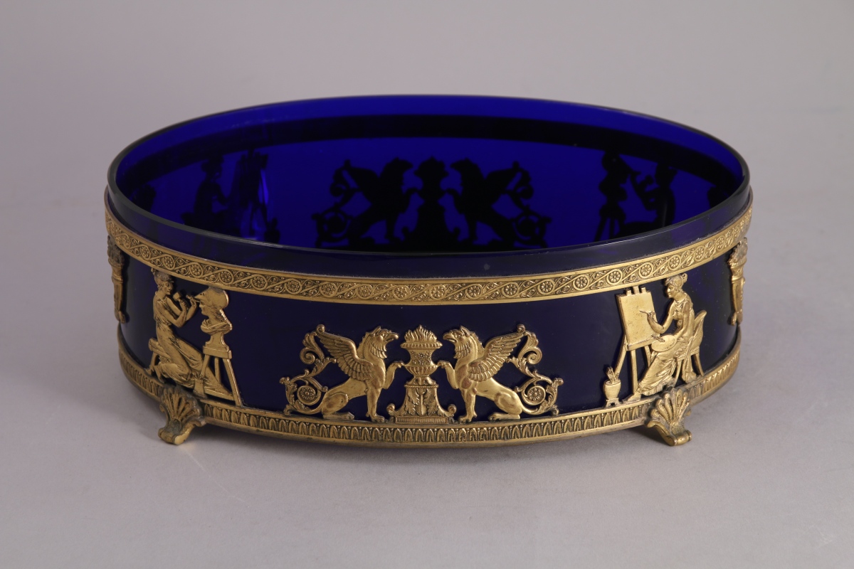 JARDINIERE de forme ovale en verre bleu. Monture en métal doré ajourée d'allégories des Arts, de griffons flanquant un pot-à-feu et de cornes d'abondance. Repose sur quatre pieds à attache de palmettes.