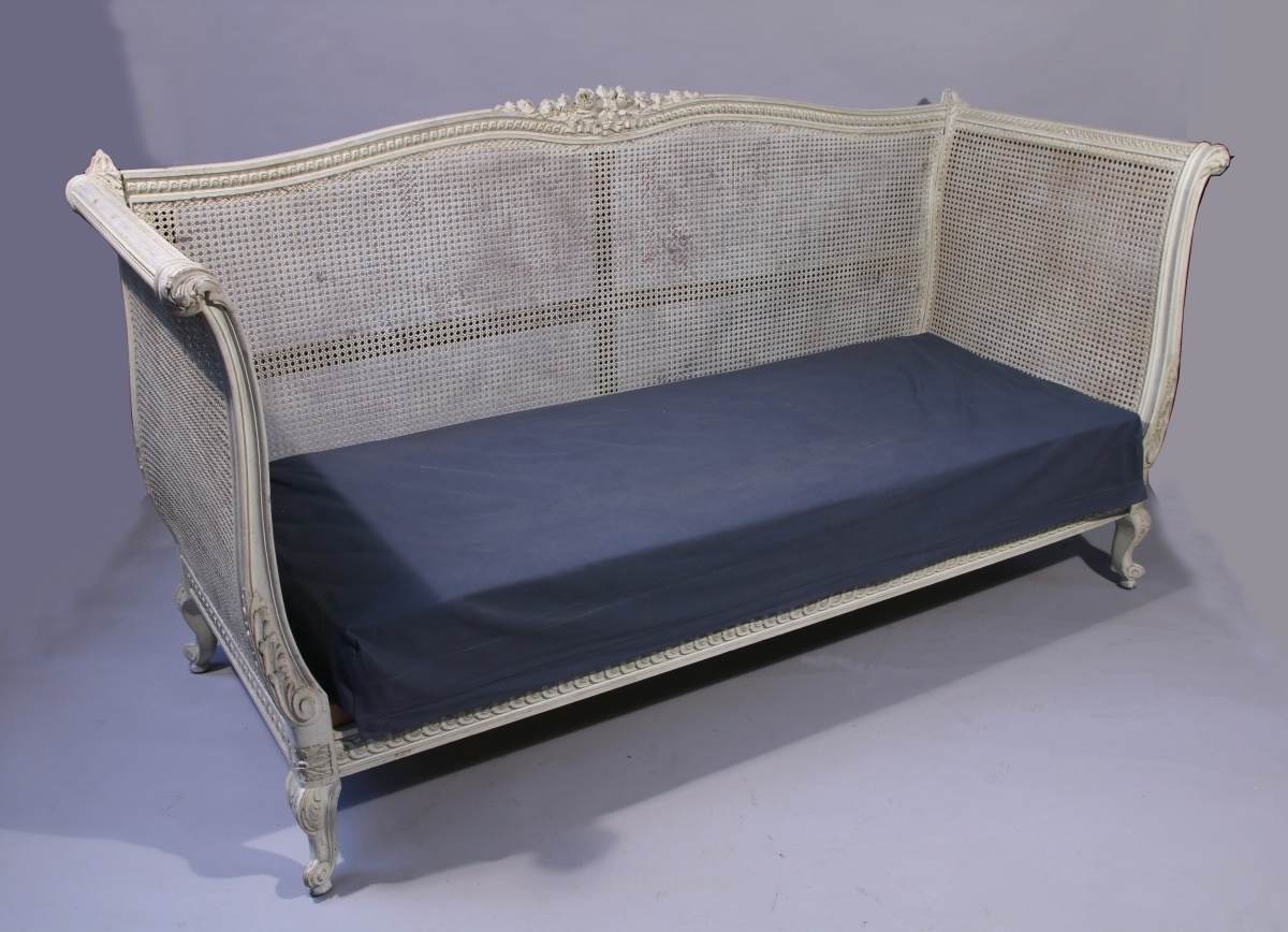 BANQUETTE cannée de forme rectangulaire en bois laqué blanc, mouluré et sculpté de palmettes, tresses et rangs de perles. Les chevets renversés, le dossier mouvementé orné d'un bouquet de fleurs. Les quatre pieds cambrés à enroulements.